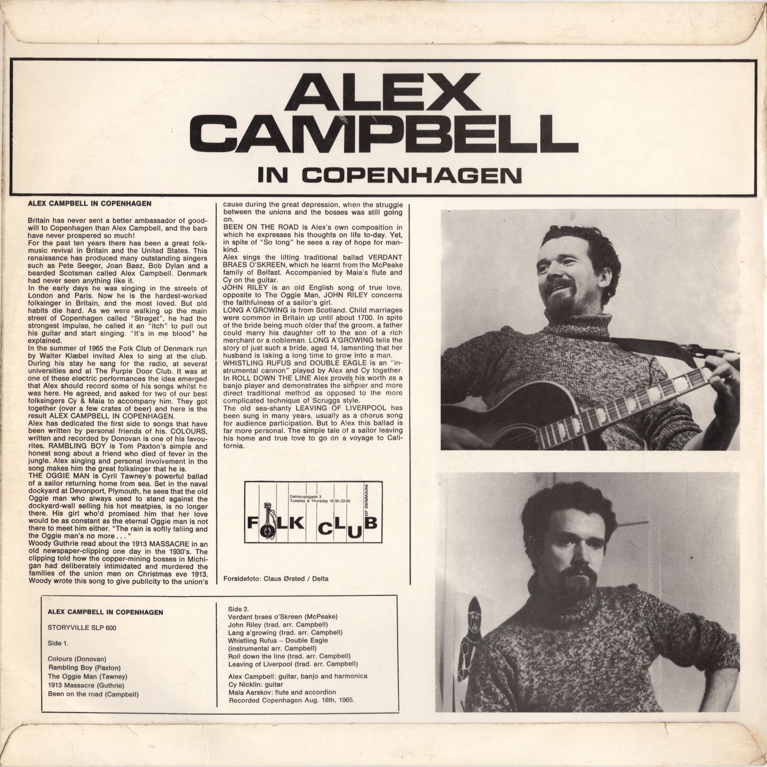 In the summer of 1965 the Folk Club of Denmark run by Walter Klæbel invited Alex to sing at the club. During his stay he sang for the radio, at several universities and at The Purple Door Club. It was at one of these electric performances the idea emerged that Alex should record some of his songs whilst he was here. He agreed, and asked for two of our best folksingers Cy & Maia to accompany him. They got together (over a few crates of beer) and here is the result ALEX CAMPBELL IN COPENHAGEN.