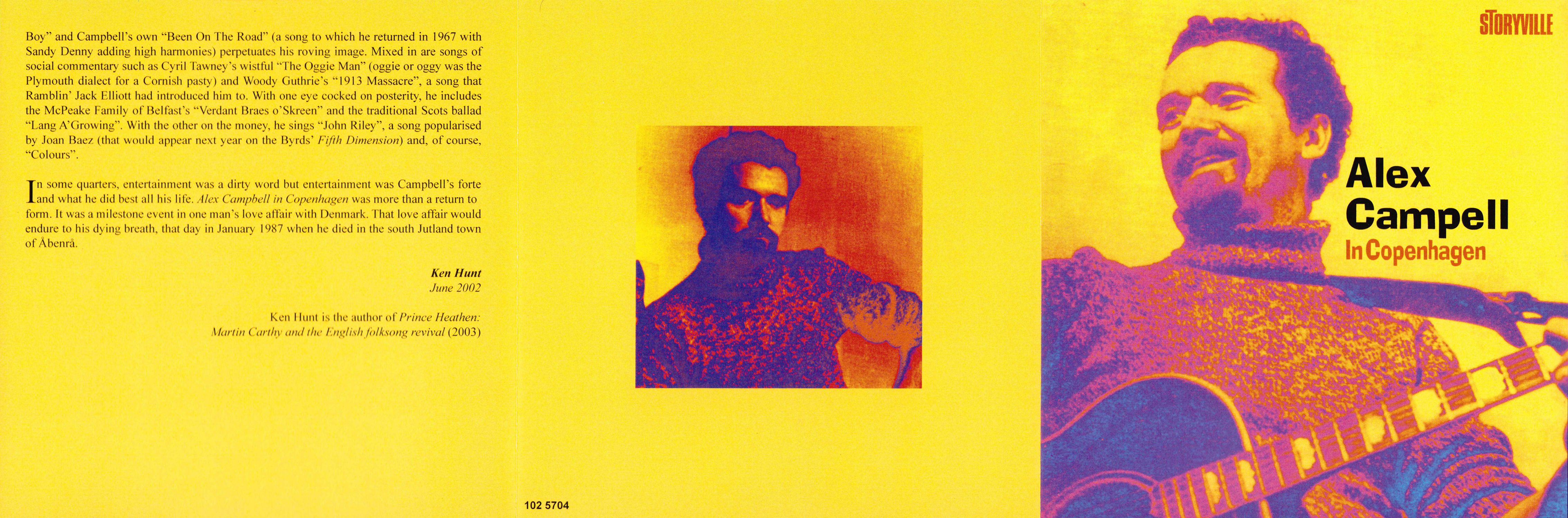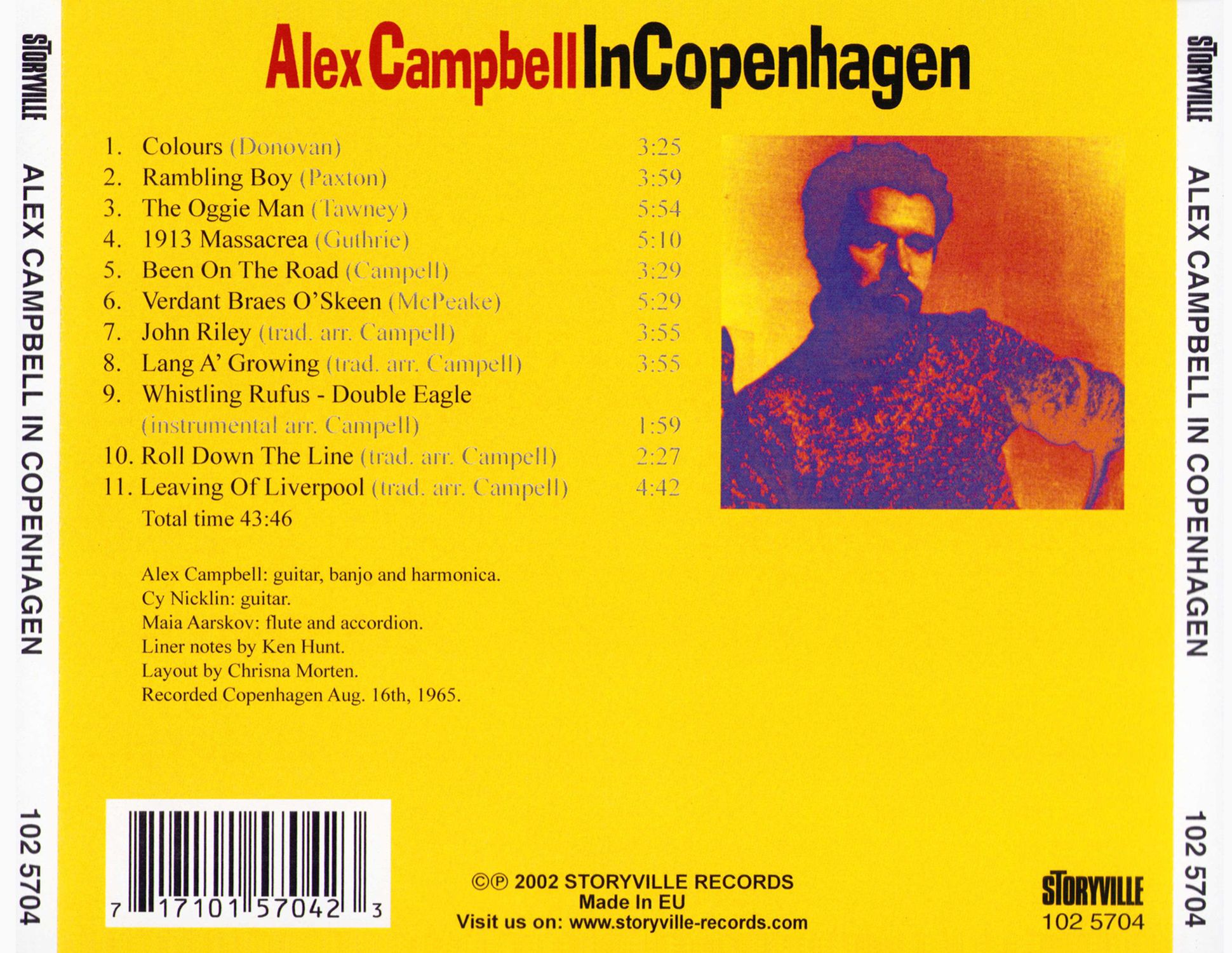 Campbell made no claims to be, as Sedley wrote, a "truly original artist". When Storyville recorded him on 16 August 1965, he had a song bag that was bang on the money. Although Cy Nicklin and Maia Aarskov, two thirds of the multinational folk trio Cy, Maia & Robert, joined him on some songs, Alex Campbell in Copenhagen is his show and above all else Campbell understood the meaning of show time. Donovan's "Colours" is a brilliant opening strategy. That July it had peaked in the British top ten (and would only appear on Donovan's Fairytale album that October) and was an international smash. Tom Paxton's "Rambling Boy" and Campbell's own "Been On The Road" (a song to which he returned in 1967 with Sandy Denny adding high harmonies) perpetuates his roving image. Mixed in are songs of social commentary such as Cyril Tawney's wistful "The Oggie Man" (oggie or oggy was the Plymouth dialect for a Cornish pasty) and Woody Guthrie's "1913 Massacre", a song that Ramblin' Jack Elliott had introduced him to. With one eye cocked on posterity, he includes the McPeake Family of Belfast's "Verdant Braes o'Skreen" and the traditional Scots ballad "Lang A'Growing". With the other on the money, he sings "John Riley", a song popularised by Joan Baez (that would appear next year on the Byrds' Fifth Dimension) and, of course, "Colours".