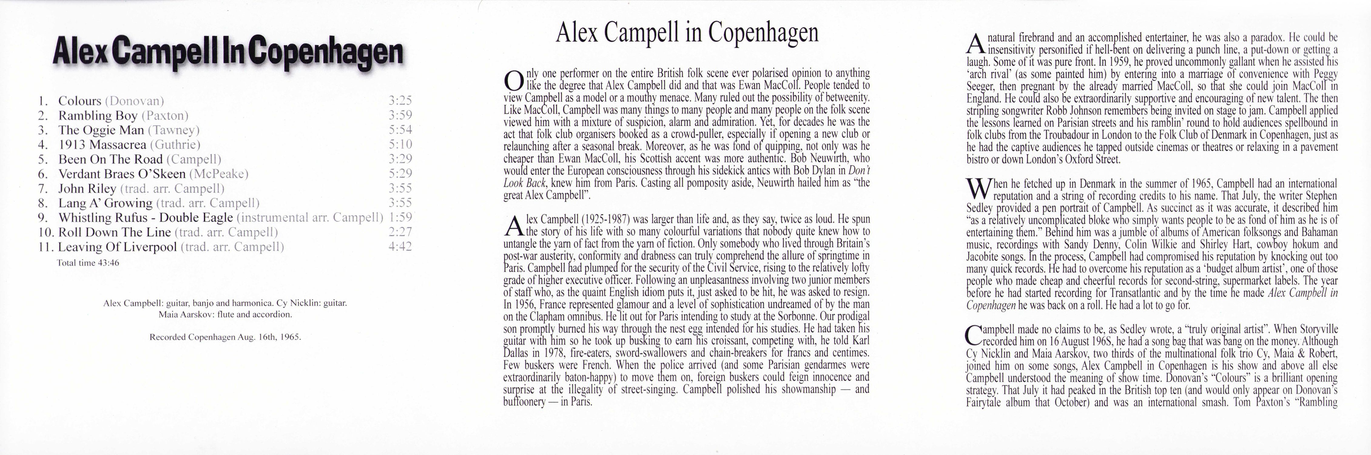 When he fetched up in Denmark in the summer of 1965, Campbell had an international reputation and a string of recording credits to his name. That July, the writer Stephen Sedley provided a pen portrait of Campbell. As succinct as it was accurate, it described him "as a relatively uncomplicated bloke who simply wants people to be as fond of him as he is of entertaining them." Behind him was a jumble of albums of American folksongs and Bahaman music, recordings with Sandy Denny, Colin Wilkie and Shirley Hart, cowboy hokum and Jacobite songs. In the process, Campbell had compromised his reputation by knocking out too many quick records. He had to overcome his reputation as a 'budget album artist', one of those people who made cheap and cheerful records for second-string, supermarket labels. The year before he had started recording for Transatlantic and by the time he made Alex Campbell in Copenhagen he was back on a roll. He had a lot to go for.