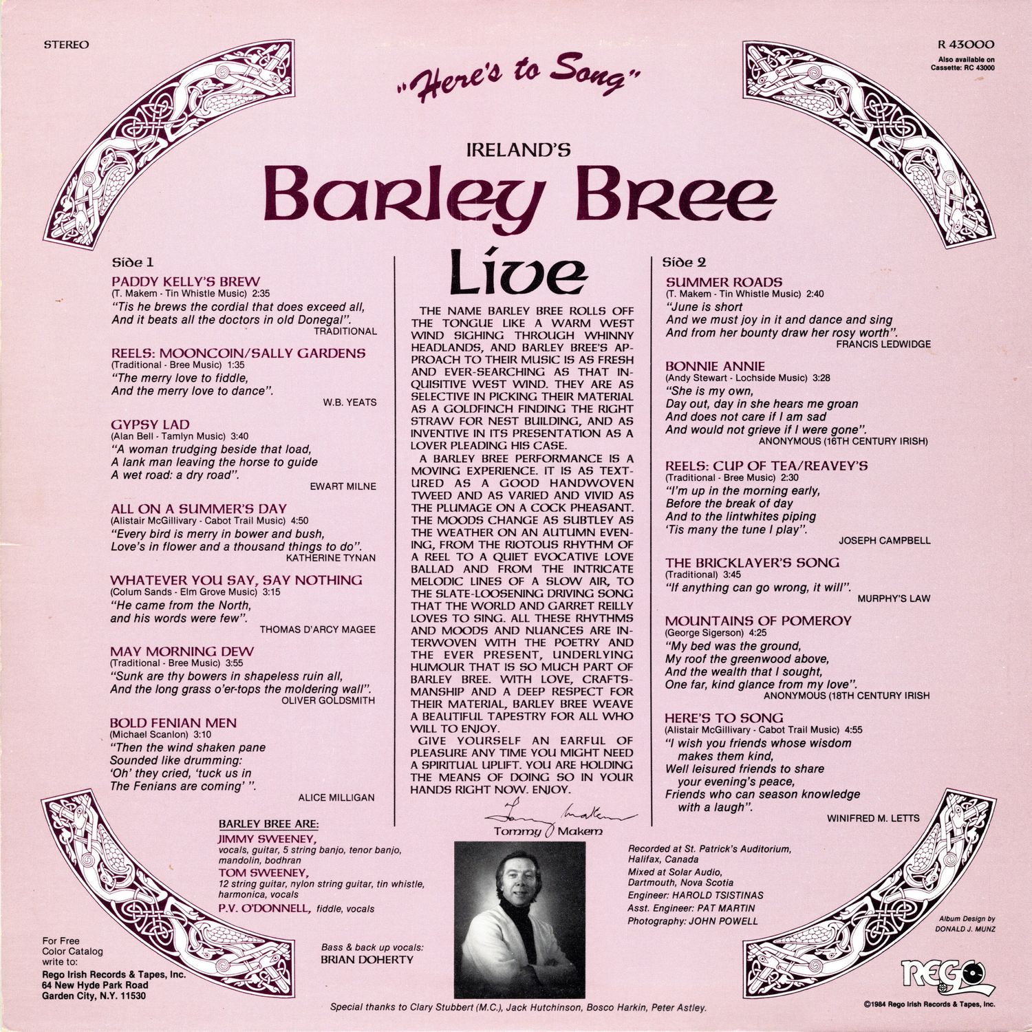 A Barley Bree performance is a moving experience. It is as textured as a good handwoven tweed and as varied and vivid as the plumage on a cock pheasant. The moods change as subtley as the weather on an autumn evening, from the riotous rhythm of a reel to a quiet evocative love ballad and from the intricate melodic lines of a slow air, to the slate-loosening driving song that the world and Garret Reilly loves to sing. All these rhythms and moods and nuances are interwoven with the poetry and the ever present, underlying humour that is so much part of Barley Bree. With love, craftsmanship and a deep respect for their material, Barley Bree weave a beautiful tapestry for all who will to enjoy.