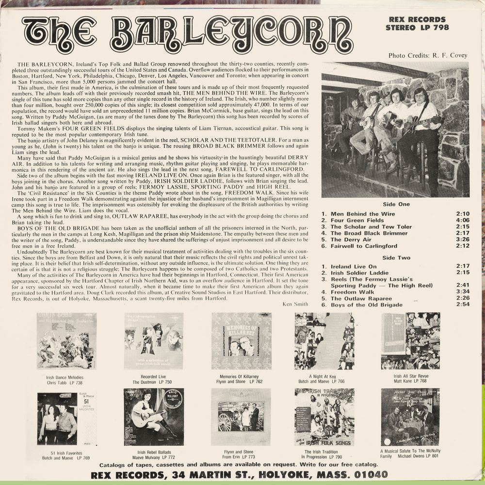 Many of the activities of The Barleycorn in America have had their beginnings in Hartford, Connecticut. Their first American appearance, sponsored by the Hartford Chapter of Irish Northern Aid, was to an overflow audience in Hartford. It set the tone for a very successful six week tour. Almost naturally, when it became time to make their first American album they again gravitated to the Hartford area. Doug Clark recorded this album, at Creative Sound Studios in East Hartford. Their distributor, Rex Records, is out of Holyoke, Massachusetts, a scant twenty-five miles from Hartford.