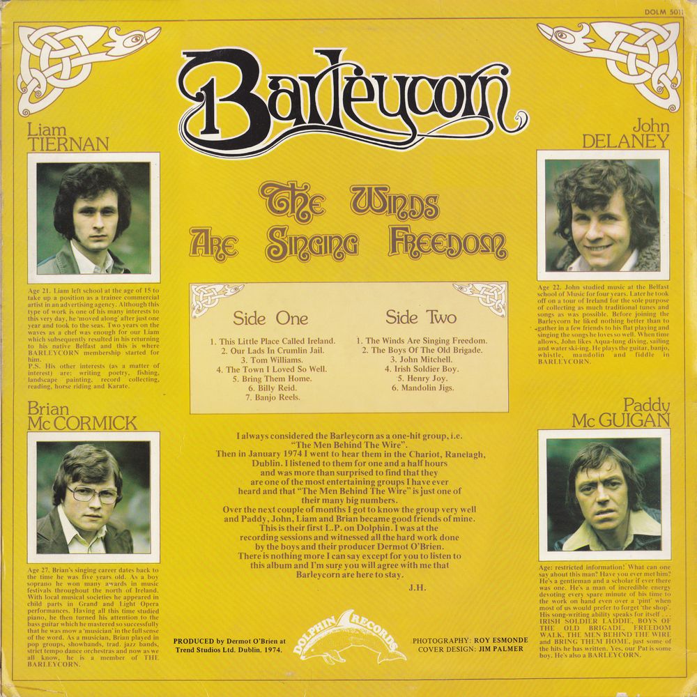 I always considered the Barleycorn as a one-hit group, i.e. "The Men Behind The Wire". Then in January 1974 I went to hear them in the Chariot, Raneiagh, Dublin. I listened to them for one and a half hours and was more than surprised to find that they are one of the most entertaining groups I have ever heard and that "The Men Behind The Wire" is just one of their many big numbers.
