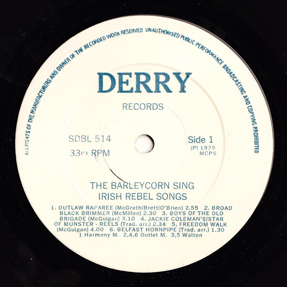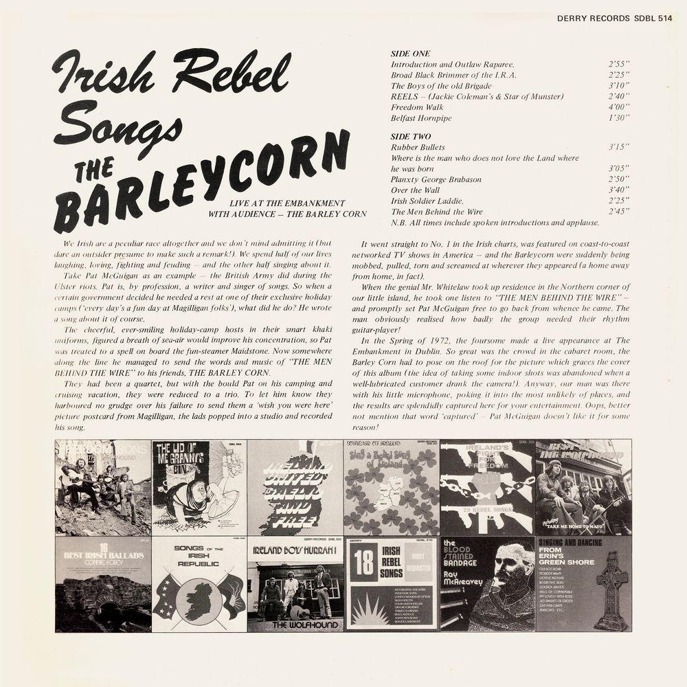 In the Spring of 1972, the foursome made a live appearance at The Embankment in Dublin. So great was the crowd in the cabaret room, the Barley Corn had to pose on the roof for the picture which graces the cover of this album (the idea of taking some indoor shots was abandoned when a well-lubricated customer drank the camera!). Anyway, our man was there with his little microphone, poking it into the most unlikely of places, and the results are splendidly captured here for your entertainment. Oops, better not mention that word 'captured' — Pat McGuigan doesn't like it for some reason!