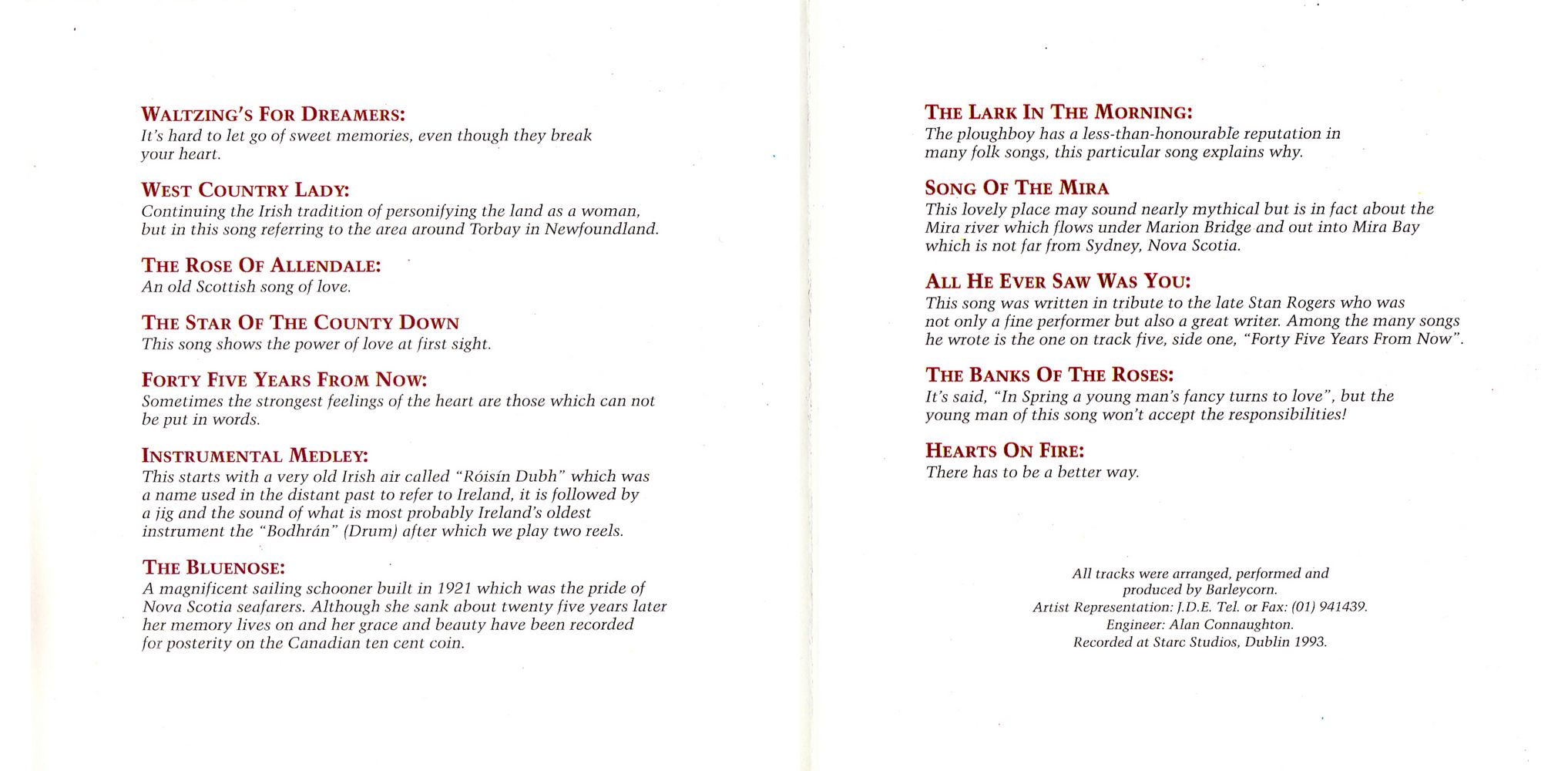 All He Ever Saw Was You — This song was written in tribute to the late Stan Rogers who was not only a fine performer but also a great writer. Among the many songs he wrote is the one on track five, side one, "Forty Five Years From Now".