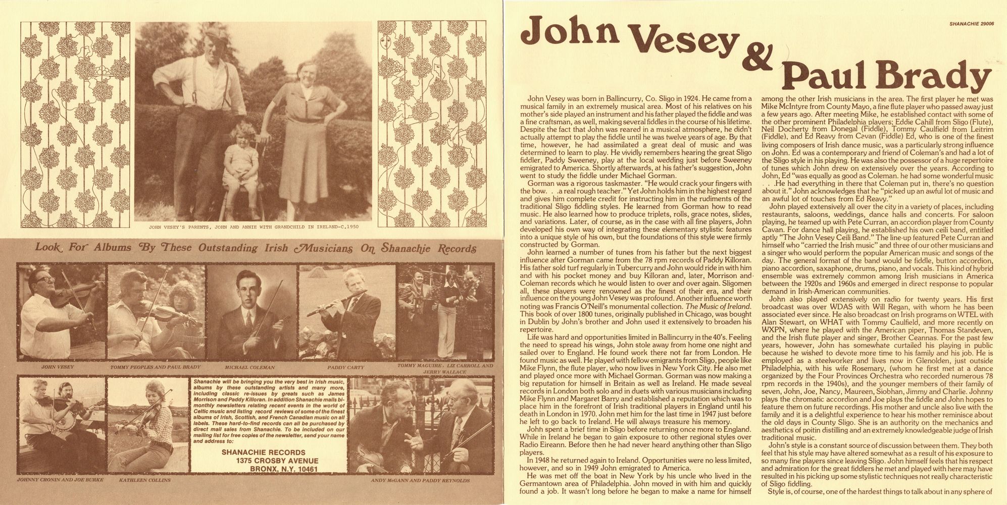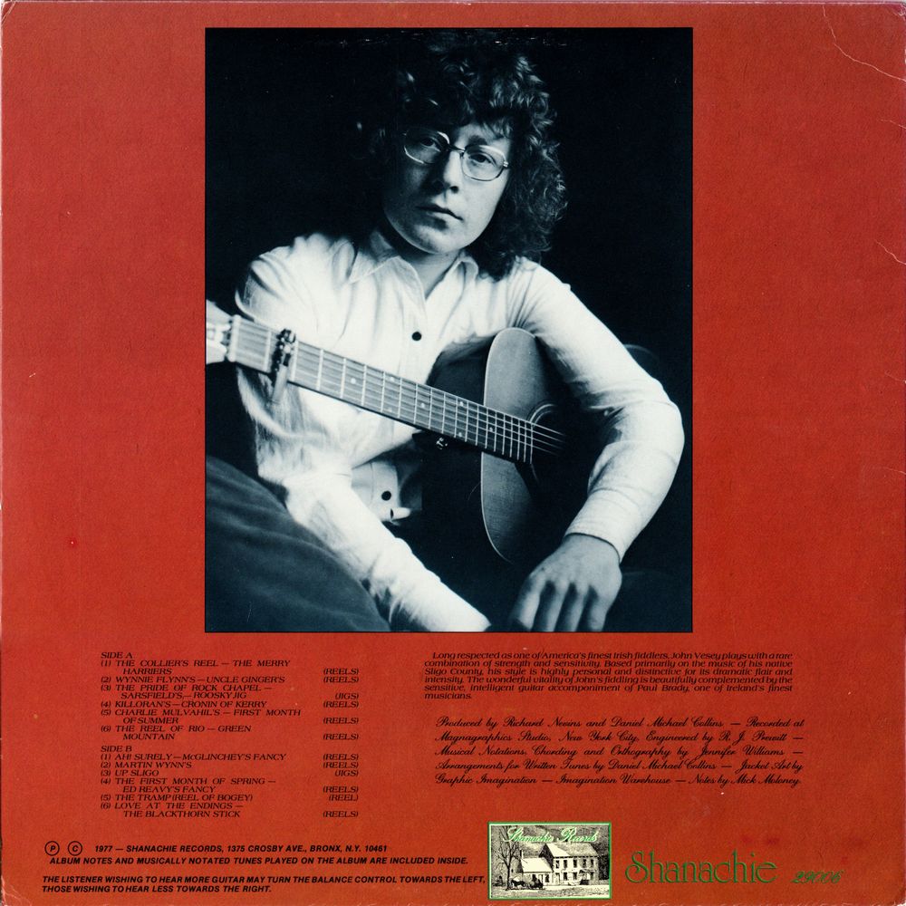 With the current cross fertilization of regional styles becoming normative among younger Irish fiddlers, it is refreshing to see a record such as this being issued. We have here a vital link in the chain which links four generations of Sligo players, starting with the O'Beirne's, the O'Dowd's, and the Gannons, continuing through Michael Coleman, Michael Gorman, Paddy Killoran, Paddy Sweeney, James Morrison, and Lad O'Beirne; passed on through the playing of Johnny McGreevy of Chicago, Paddy Marren of County Sligo, whom John particularly admires, Martin Wynne of New York and, of course, John Vesey himself (and certainly a major influence in the playing styles of O'Beirne's proteges in New York City, Andy McGann and Paddy Reynolds); and carried on today among the younger generation of fiddlers in the playing of Brian Conway and Tony De Marco of New York and Miles Krassen of Indiana.