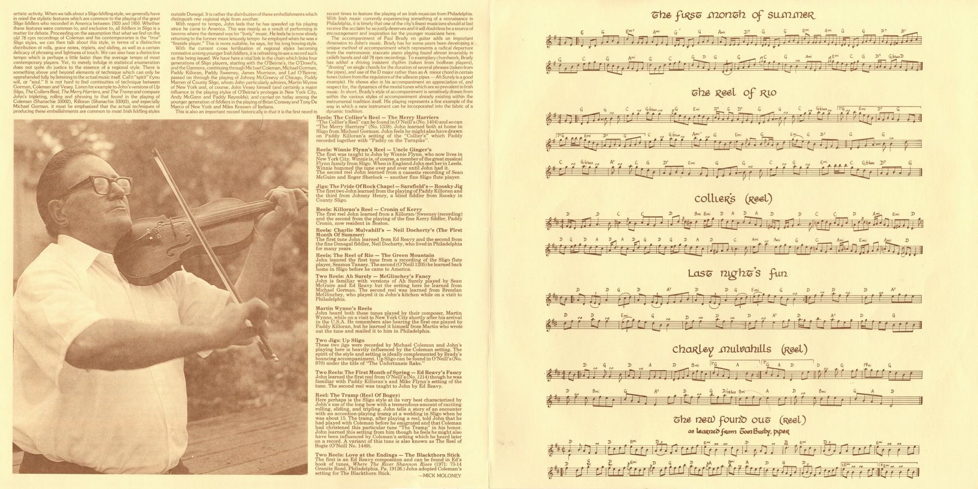 The first two John learned from the playing of Paddy Killoran and the third from Johnny Henry, a blind fiddler from Roosky in County Sligo.