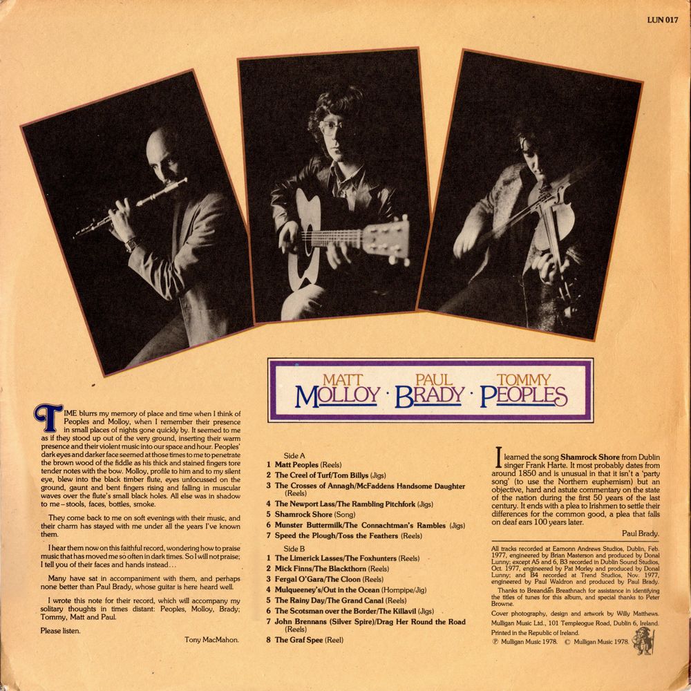 Time blurrs my memory of place and time when I think of Peoples and Molloy, when I remember their presence in small places of nights gone quickly by. It seemed to me as if they stood up out of the very ground, inserting their warm presence and their violent music into our space and hour. Peoples' dark eyes and darker face seemed at those times to me to penetrate the brown wood of the fiddle as his thick and stained fingers tore tender notes with the bow. Molloy, profile to him and to my silent eye, blew into the black timber flute, eyes unfocussed on the ground, gaunt and bent fingers rising and falling in muscular waves over the flute's small black holes. All else was in shadow to me — stools, faces, bottles, smoke.