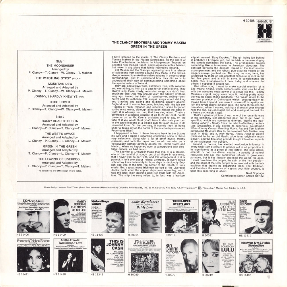 That's a general picture of war, one of the romantic wars of the somehow less-dangerous past, but to get down to specifics, which are somewhat different, there's the hair-raising Johnny, I Hardly Knew Ye, which effectively neutralizes (devastates, if you prefer) its superficial counterpart When Johnny Comes Marching Home. Pat and Tom Makem introduced Mountain Dew to the Newport Folk Festival way back in 1959, and it, Irish Rover, Rocky Road to Dublin (believed to be an old Gaelic pipe tune, originally much slower), and the title song provide insight into other aspects of the traditional Irish outlook.