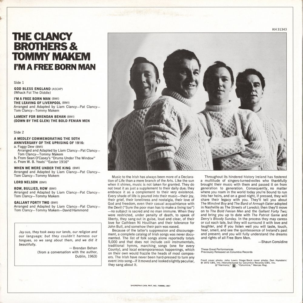 Throughout its hindered history Ireland has fostered a multitude of singers-turned-exiles who thankfully brought their music with them and passed it on from generation to generation. Consequently, no matter where you roam in the world today you're bound to run into her heirs, and on a good night, if pressed, they will share their legacy with you. They'll tell you about The Minstrel Boy and The Bard of Armagh (later adoptee in Nashville as The Streets of Laredo); then they'll move on to The Bold Fenian Men and the Gallant Forty Two; and bring you up to date with The Patriot Game and Derry's Bloody Sunday. In the process they may caress or cut each tale, but they will surround it with love and laughter, and if you listen well you will taste, touch, hear, smell, and see the quintessence of Ireland's past and present; and you will fully understand the dreams and rights of all Free Born Men.
