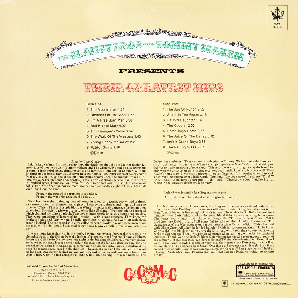 I don't know if most Irishmen realize how thankful they should be to Mother England. I know four of them who do — Tommy Makem and The Clancys. We make a nice living out of singing Irish rebel songs, drinking songs and laments of one sort or another. Without England on our backs, they would never have been made. The rebel songs, of course, come from a 700-year struggle to shake off John Bull's benevolence, the laments from all the times we were beaten down and, needless to say, a drink is always needed to raise the heart in troubled times. I suppose, too, we're fortunate to be speaking English. The patrons of Folk City or One Sheridan Square might not be too happy with a night of Gaelic. It's an ill wind that blows no good.