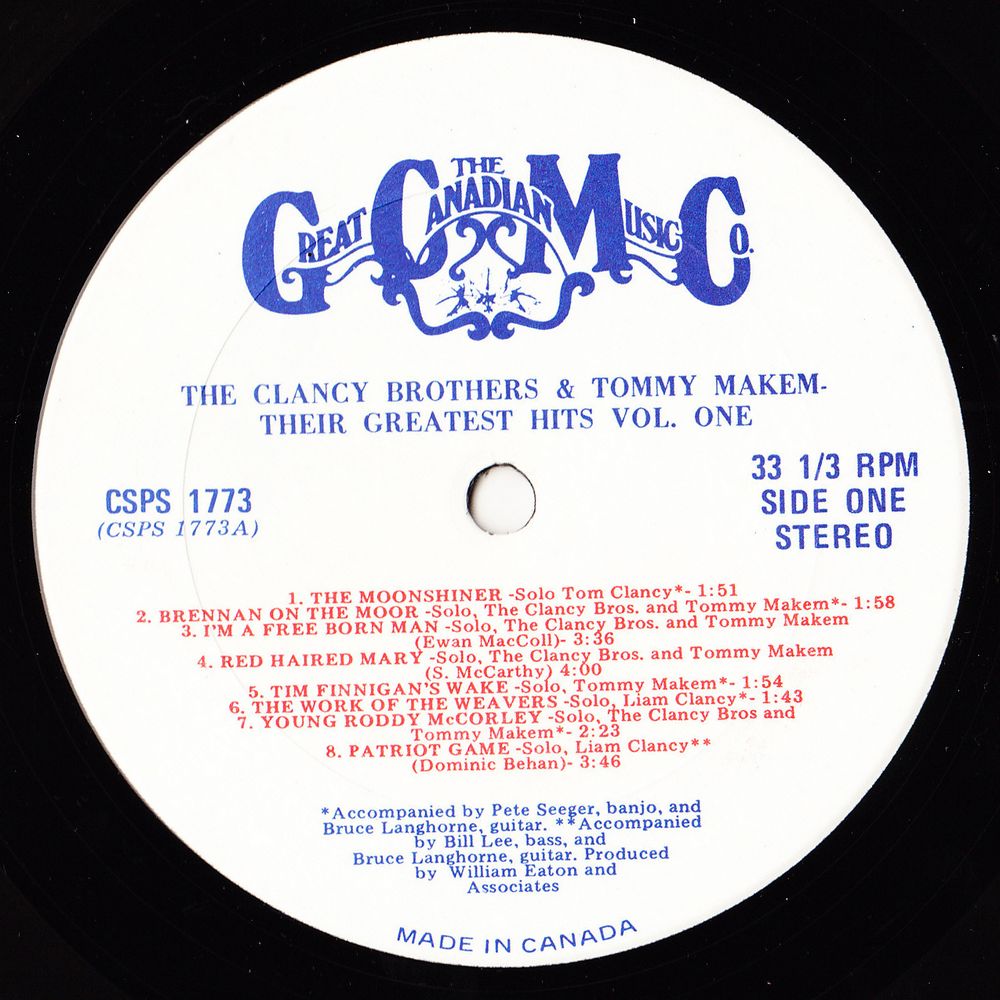 It was on one leg of this trip, in the north, beyond that mystical border that separates the blessed subjects of the Queen from the Irish misfortunates, that I first met Tommy Makem. I went to a Ceilidhe in Newry town one night in the big dance hall there. I was very embarrassed when the band leader announced, in the midst of the fun and dancing, that this one poor chap was going to sing, and not a person in the hall stopped talking or looked up at the stage. Your man wasn't fazed in the slightest — he just sat down and started silently to work on his boot. One person looked up and another, and in ten seconds you could hear a pin drop. Then, when he had complete attention, he started to sing — "O, me name is Dick Darby, I'm a cobbler." That was my introduction to Tommy. We both took the "emigrant ship" to America the next year. When we all got together in New York, the first thing we did was to make an album of rebel songs. This record was a little rough, to say the least. Not only were we unaccustomed to singing together, but I hardly knew my brothers at all. They had left home when I was only a nipper. I'll never forget our first meeting when I arrived. They were looking me over a little warily. Tom said. "Do You smoke?" I said no. "Drink?" "No," I said. "Well, do you court girls?" "I do," said I. "Thanks be to God," said he. He was beginning to seriously doubt my legitimacy.