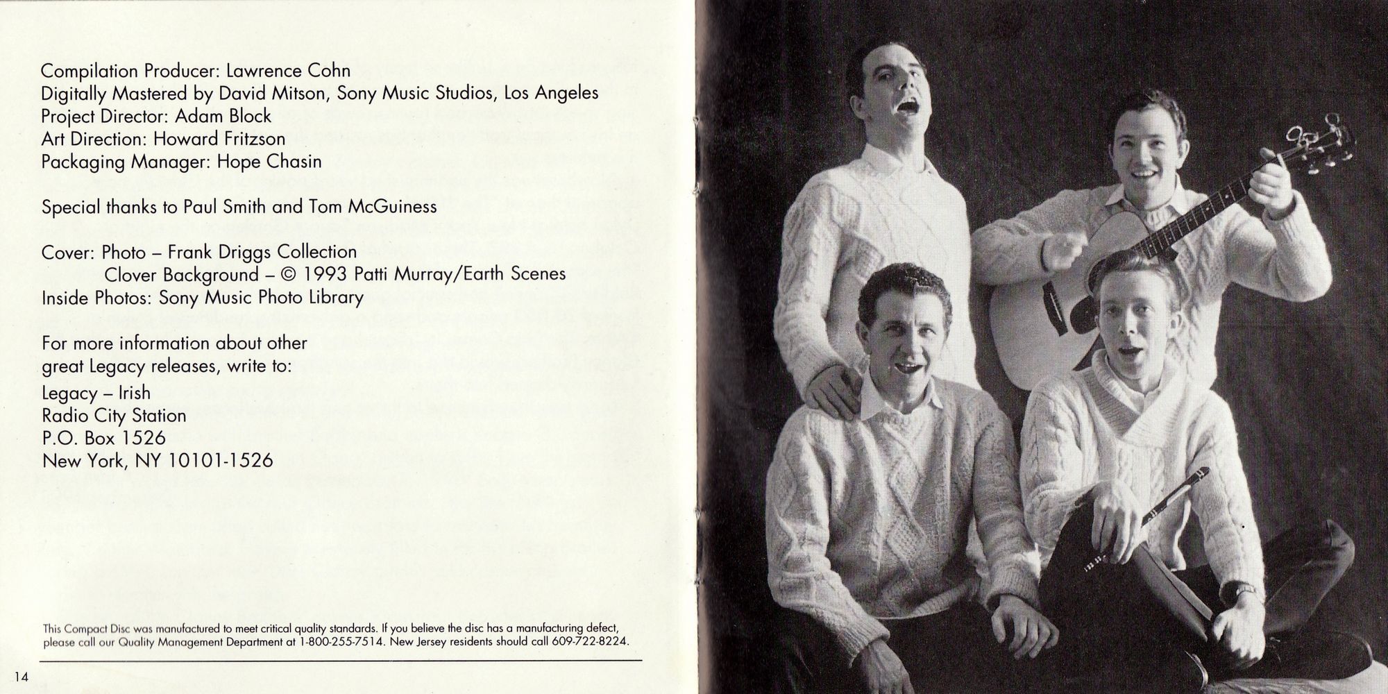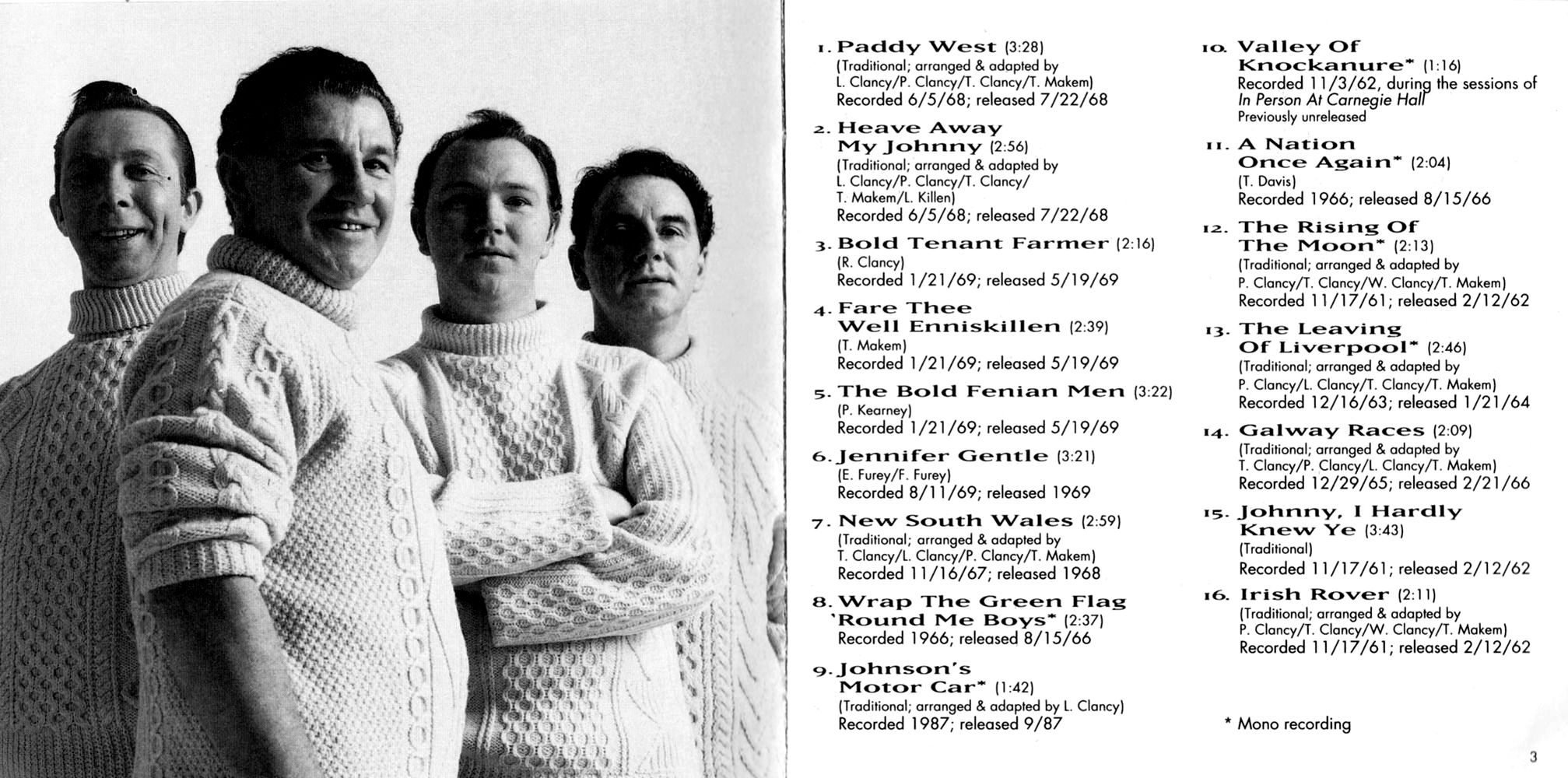 There are historical inacuracies in the above sleeve notes: Bobby Clancy was Tommy Makem's first replacement, and appeared on 3 ablums before Louis Killen joined the group. In Person At Carnegie Hall was not one of the "last times" the original group appeared together. It was their 3rd Columbia album, released in 1963.
