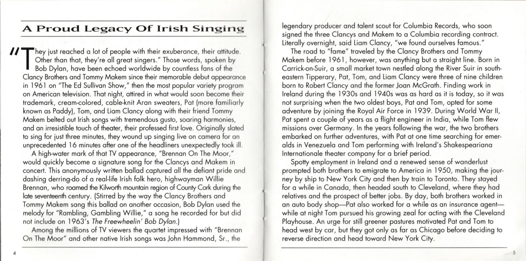 "They just reached a lot of people with their exuberance, their attitude. Other than that, they're all great singers." Those words, spoken by Bob Dylan, have been echoed worldwide by countless fans of the Clancy Brothers and Tommy Makem since their memorable debut appearance in 1961 on "The Ed Sullivan Show," then the most popular variety program on American television. That night, attired in what would soon become their trademark, cream-colored, cable-knit Aran sweaters, Pat (more familiarly known as Paddy), Tom, and Liam Clancy along with their friend Tommy Makem belted out Irish songs with tremendous gusto, soaring harmonies, and an irresistible touch of theater, their professed first love. Originally slated to sing for just three minutes, they wound up singing live on camera for an unprecedented 16 minutes after one of the headliners unexpectedly took ill.