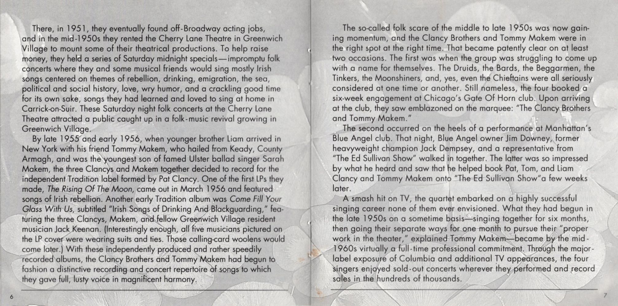 The so-called folk scare of the middle to late 1950s was now gaining momentum, and the Clancy Brothers and Tommy Makem were in the right spot at the right time. That became patently clear on at least two occasions. The first was when the group was struggling to come up with a name for themselves. The Druids, the Bards, the Beggarmen, the Tinkers, the Moonshiners, and, yes, even the Chieftains were all seriously considered at one time or another. Still nameless, the four booked a six-week engagement at Chicago's Gate Of Horn club. Upon arriving at the club, they saw emblazoned on the marquee: "The Clancy Brothers and Tommy Makem."