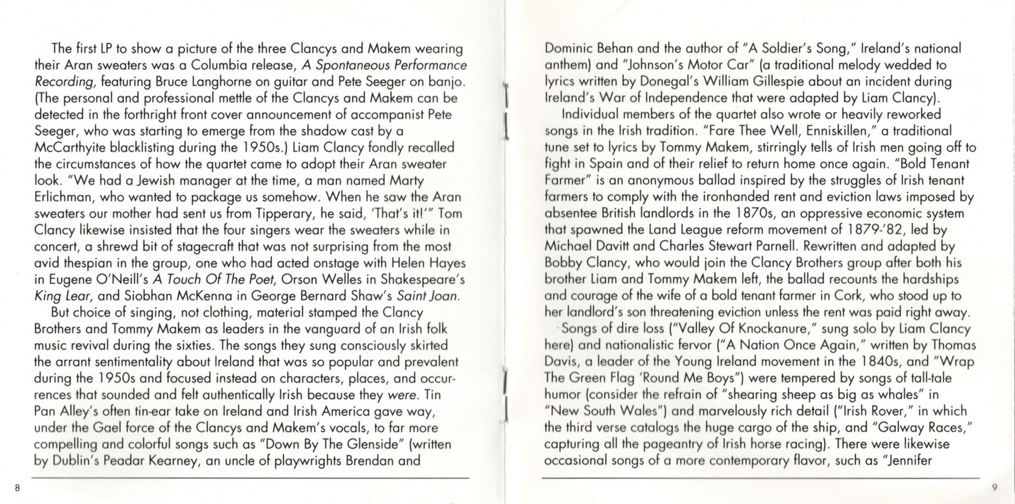 The first LP to show a picture of the three Clancys and Makem wearing their Aran sweaters was a Columbia release, A Spontaneous Performance Recording, featuring Bruce Langhorne on guitar and Pete Seeger on banjo. (The personal and professional mettle of the Clancys and Makem can be detected in the forthright front cover announcement of accompanist Pete Seeger, who was starting to emerge from the shadow cast by a McCarthyite blacklisting during the 1950s.) Liam Clancy fondly recalled the circumstances of how the quartet came to adopt their Aran sweater look. "We had a Jewish manager at the time, a man named Marty Erlichman, who wanted to package us somehow. When he saw the Aran sweaters our mother had sent us from Tipperary, he said, 'That's it!'" Tom Clancy likewise insisted that the four singers wear the sweaters while in concert, a shrewd bit of stagecraft that was not surprising from the most avid thespian in the group, one who had acted onstage with Helen Hayes in Eugene O'Neill's A Touch Of The Poet, Orson Welles in Shakespeare's King Lear, and Siobhan McKenna in George Bernard Shaw's Saint Joan.