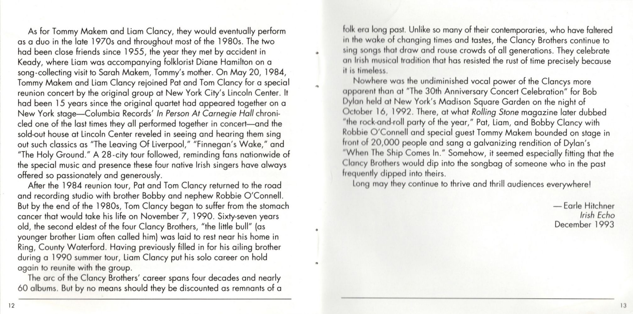 Nowhere was the undiminished vocal power of the Clancys more apparent than at "The 30th Anniversary Concert Celebration" for Bob Dylan held at New York's Madison Square Garden on the night of October 16, 1992. There, at what Rolling Stone magazine later dubbed "the rock-and-roll party of the year," Pat, Liam, and Bobby Clancy with Robbie O'Connell and special guest Tommy Makem bounded on stage in front of 20,000 people and sang a galvanizing rendition of Dylan's "When The Ship Comes In." Somehow, it seemed especially fitting that the Clancy Brothers would dip into the songbag of someone who in the past frequently dipped into theirs.