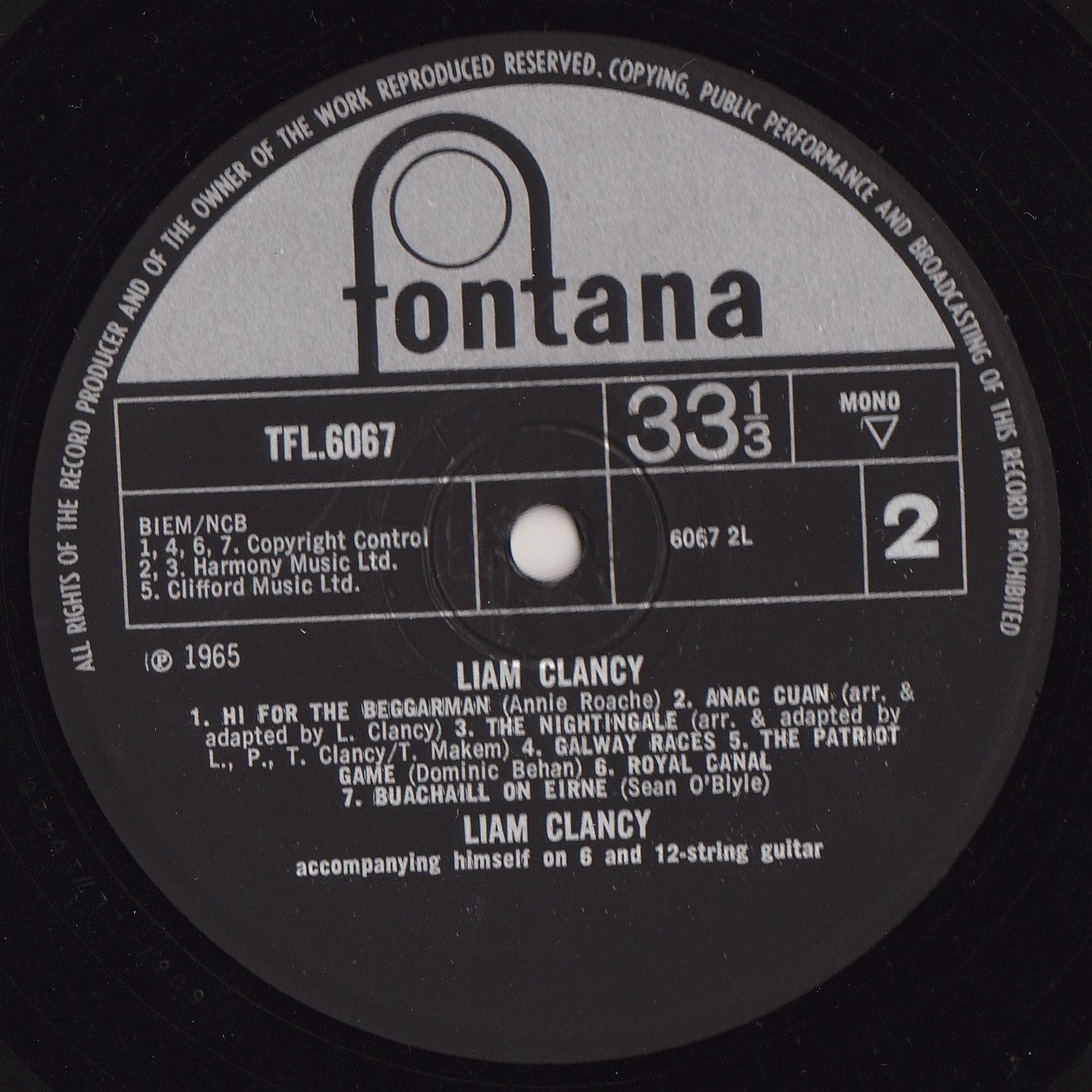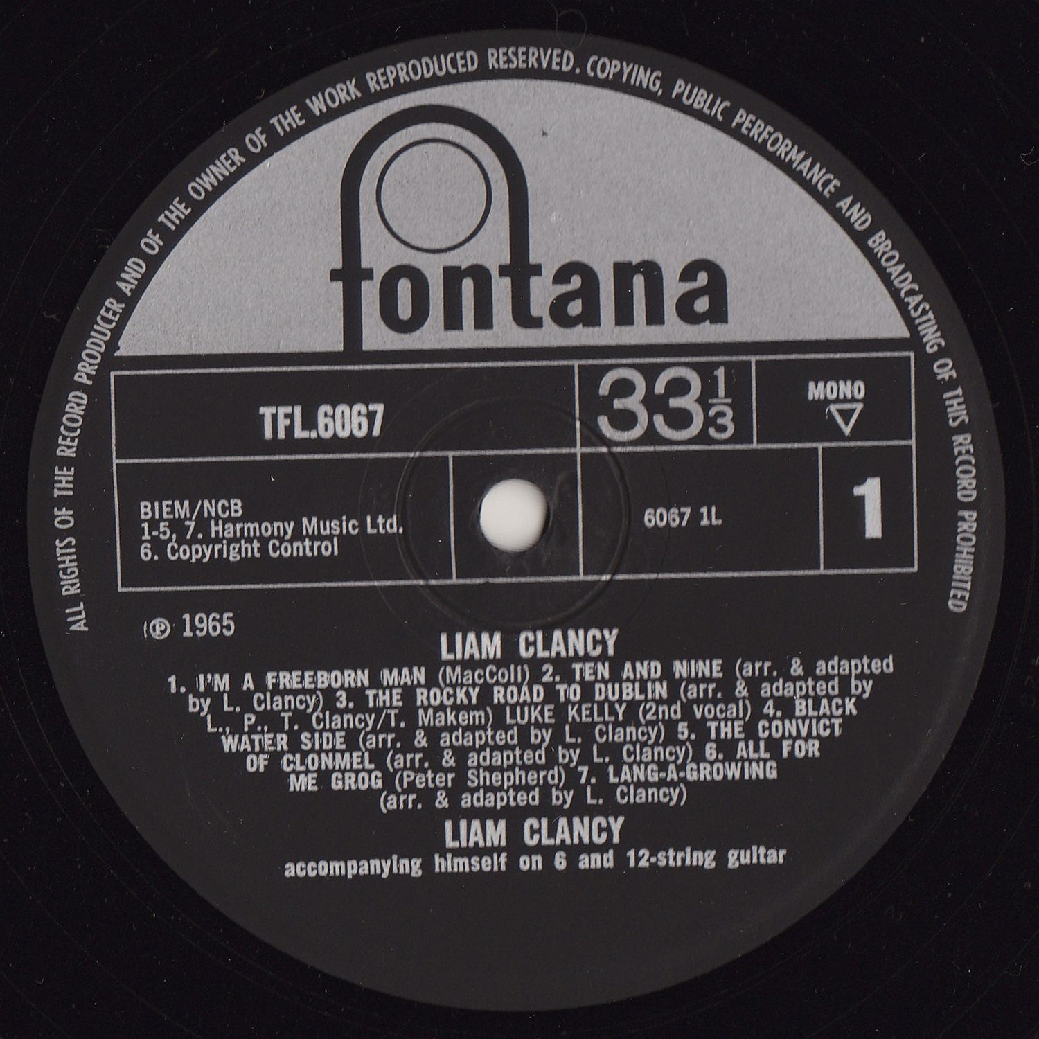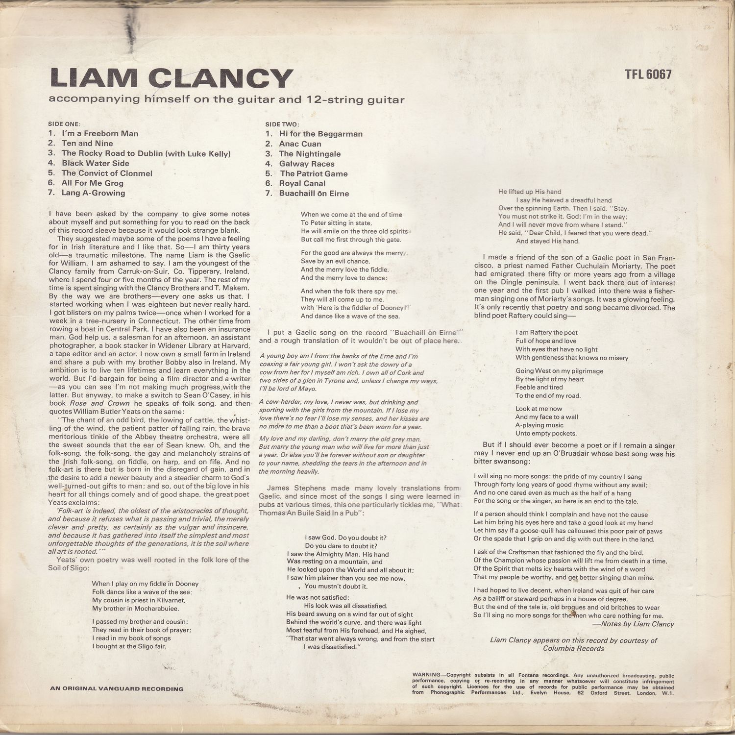They suggested maybe some of the poems I have a feeling for in Irish literature and I like that. So — I am thirty years old — a traumatic milestone. The name Liam is the Gaelic for William, I am ashamed to say. I am the youngest of the Clancy family from Carrick-on-Suir, Co. Tipperary, Ireland, where I spend four or five months of the year. The rest of my time is spent singing with the Clancy Brothers and T. Makem. By the way we are brothers — every one asks us that. I started working when I was eighteen but never really hard. I got blisters on my palms twice — once when I worked for a week in a tree-nursery in Connecticut. The other time from rowing a boat in Central Park. I have also been an insurance man, God help us. a salesman for an afternoon, an assistant photographer, a book stacker in Widener Library at Harvard, a tape editor and an actor. I now own a small farm in Ireland and share a pub with my brother Bobby also in Ireland. My ambition is to live ten lifetimes and learn everything in the world. But I'd bargain for being a film director and a writer — as you can see I'm not making much progress with the latter. But anyway, to make a switch to Seán O'Casey, in his book Rose and Crown he speaks of folk song, and then quotes William Butler Yeats on the same: