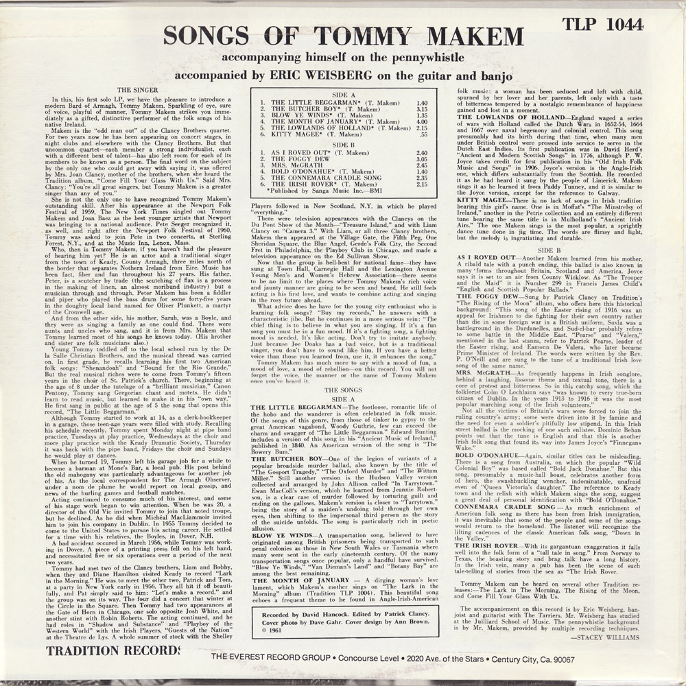 In this, his first solo LP, we have the pleasure to introduce a modern Bard of Armagh, Tommy Makem. Sparkling of eye, sure of voice, playful of manner, Tommy Makem strikes you immediately as a gifted, distinctive performer of the folk songs of his native Ireland.