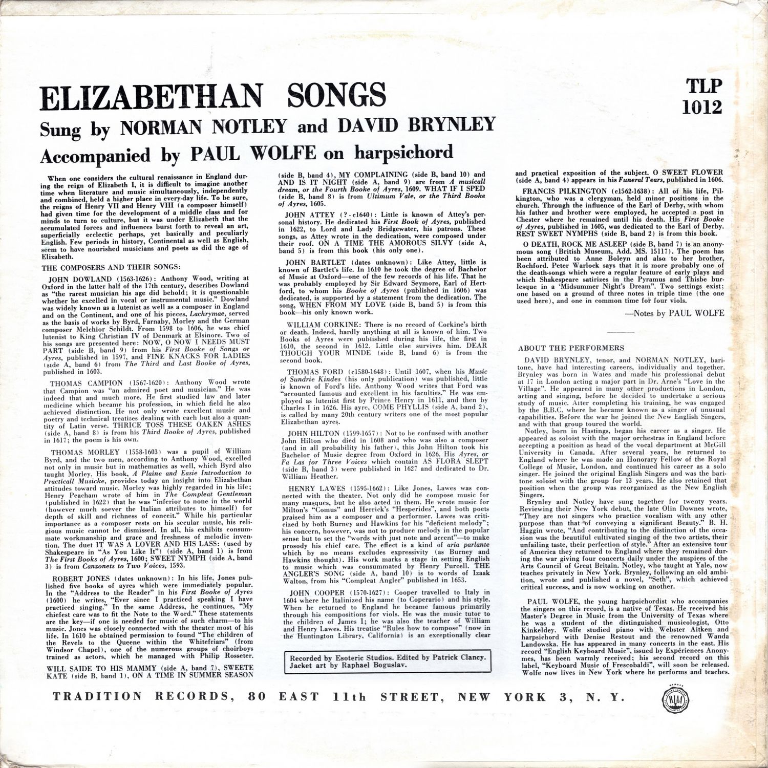 PAUL WOLFE, the young harpsichordist who accompanies the singers on this record, is a native of Texas. He received his Master's Degree in Music from the University of Texas where he was a student of the distinguished musicologist, Otto Kinkeldey. Wolfe studied piano with Webster Aitken and harpsichord with Denise Restout and the renowned Wanda Landowska. He has appeared in many concerts in the east. His record "English Keyboard Music", issued by Experiences Anonymes, has been warmly received; his second record on this label, "Keyboard Music of Freseobaldi", will soon he released. Wolfe now lives in New York where he performs and teaches.