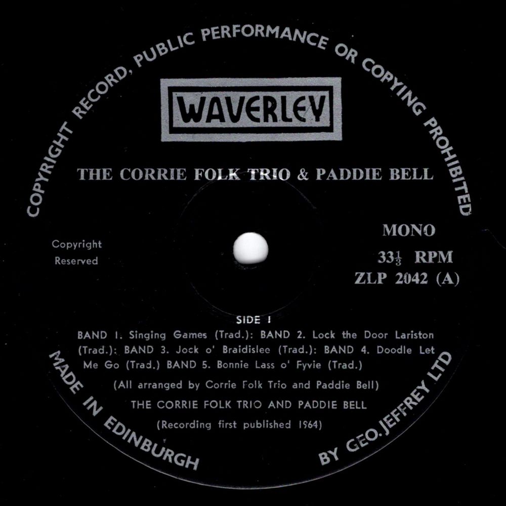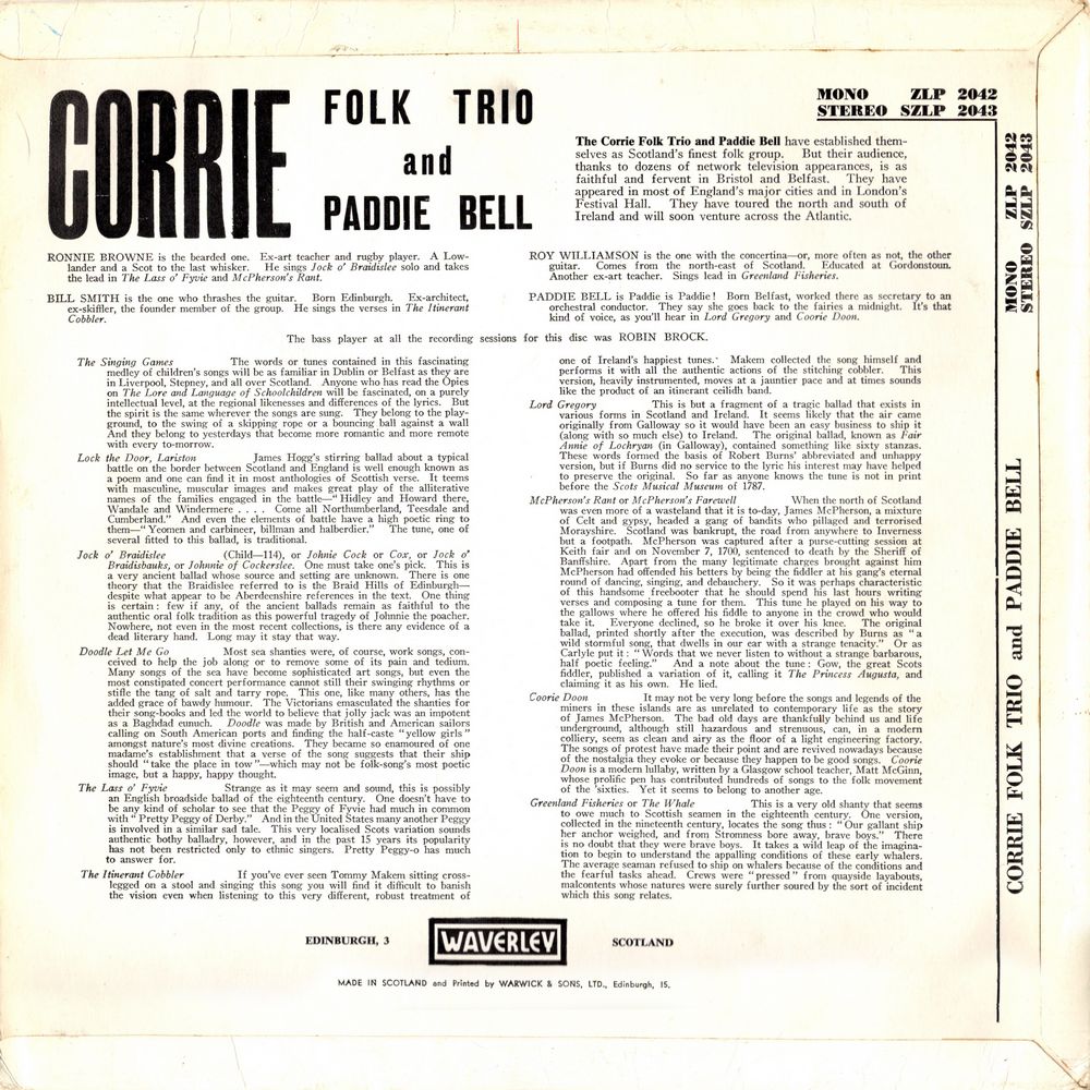 The Corrie Folk Trio and Paddie Bell have established themselves as Scotland's finest folk group. But their audience, thanks to dozens of network television appearances, is as faithful and fervent in Bristol and Belfast. They have appeared in most of England's major cities and in London's Festival Hall. They have toured the north and south of Ireland and will soon venture across the Atlantic.