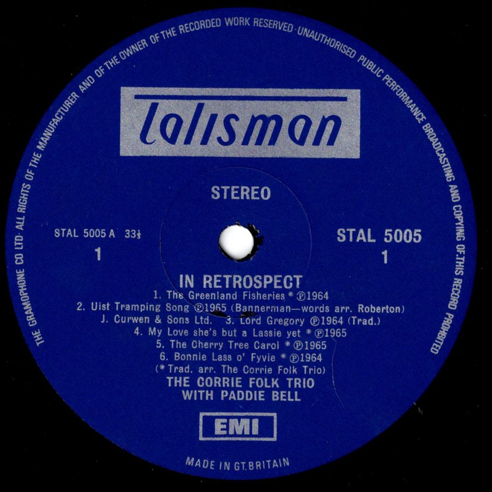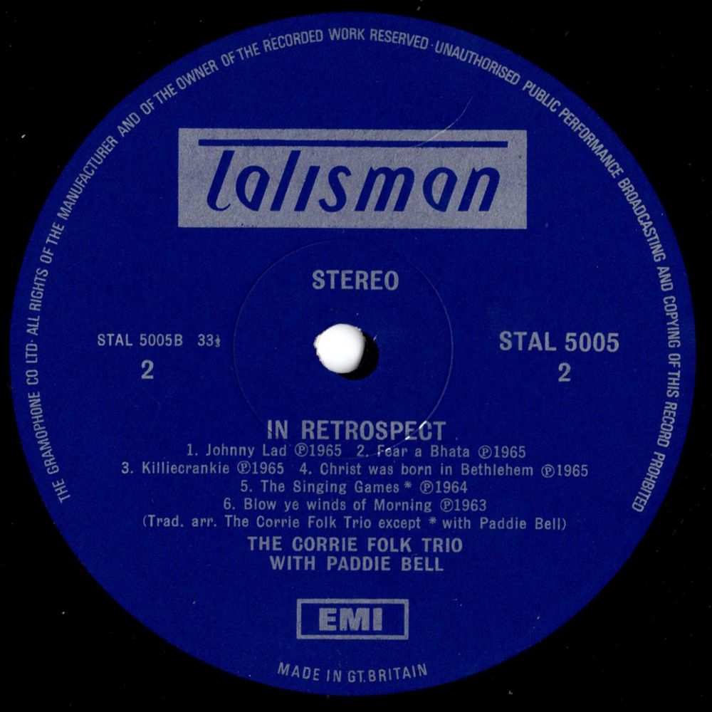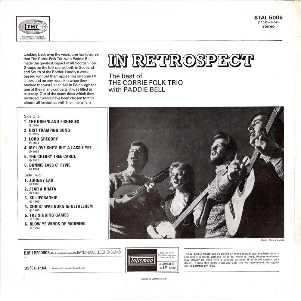 Looking back over the years, one has to agree that The Corrie Folk Trio with Paddie Bell made the greatest impact of all Scottish Folk Groups on the folk scene, both in Scotland and South of the Border. Hardly a week passed without them appearing on some TV show, and on any occasion when they booked the vast Usher Hall in Edinburgh for one of their many concerts, it was filled to capacity. Out of the many titles which they recorded, twelve have been chosen for this album, all favourites with their many fans.