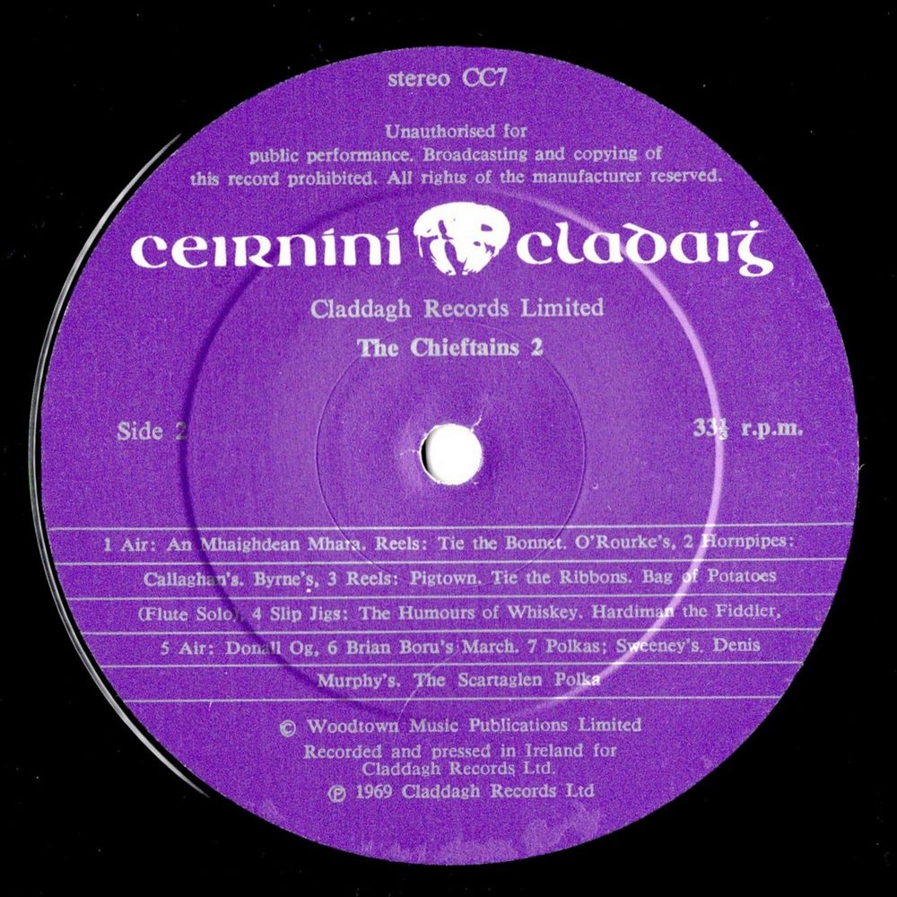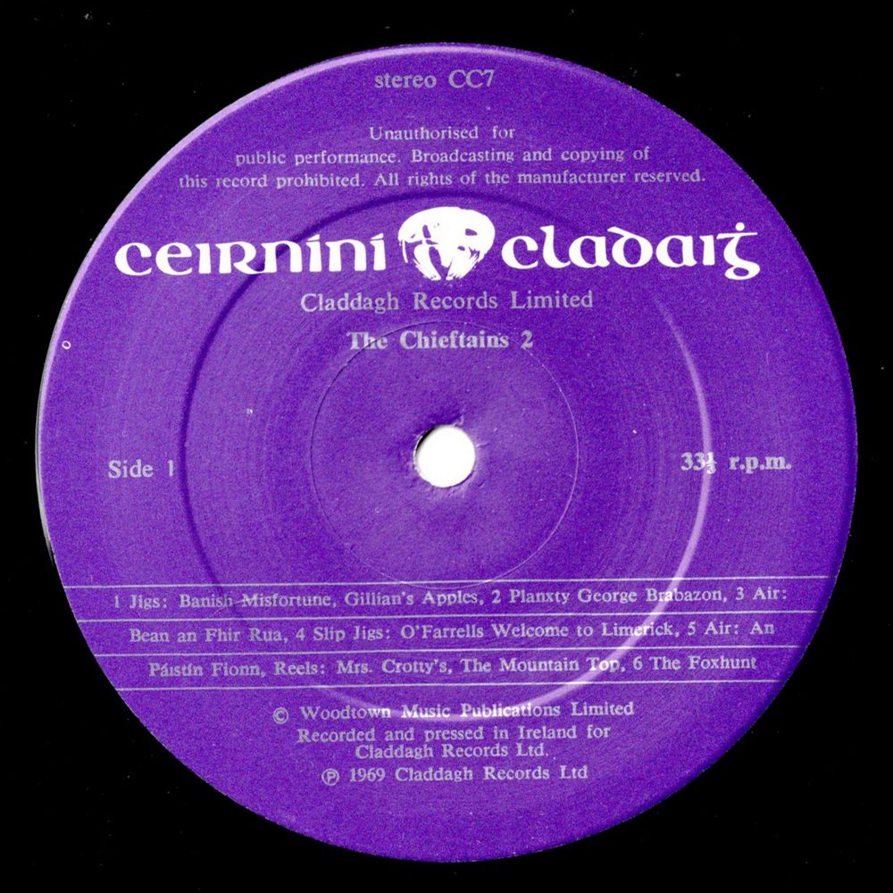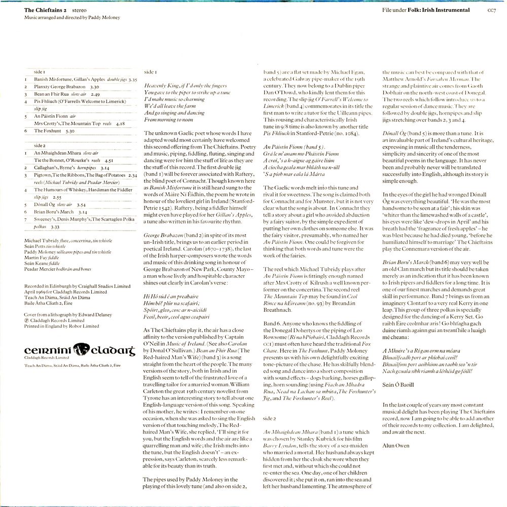 The unknown Gaelic poet whose words I have adapted would most certainly have welcomed this second offering from The Chieftains. Poetry and music, piping, fiddling, fluting, singing and dancing were for him the stuff of life as they are the stuff of this record. The first double jig (band 1) will be forever associated with Raftery, the blind poet of Connacht. Though known here as Banish Misfortune it is still heard sung to the words of Máire Ní Éidhin, the poem he wrote in honour of the loveliest girl in Ireland (Stanford-Petrie 1542). Raftery, being a fiddler himself might even have played for her Gillan's Apples, a tune also written in his favourite rhythm.