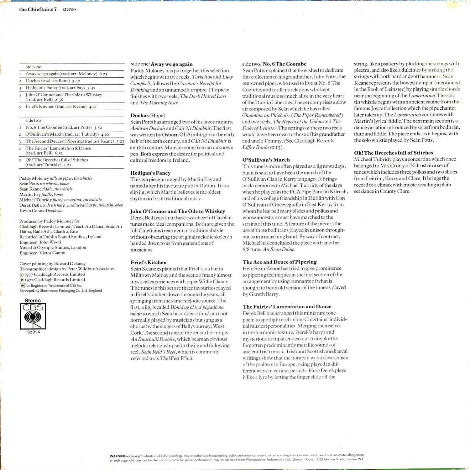The Fairies' Lamentation and Dance — Derek Bell has arranged this miniature tone-poem to spotlight each of the Chieftains' individual musical personalities. Merging themselves in the harmonic texture, Derek's harps and mysterious tiompán endeavour to invoke the forgotten predominantly metallic sounds of ancient Irish music. Irish and Scottish mediaeval writings show that the tiompán was a close cousin of the psaltery in Europe, being played in different ways in various periods. Here Derek plays it like a lyre by letting the finger slide off the string, like a psaltery by plucking the strings with plectra, and also like a dulcimer by striking the strings with both hard and soft hammers. Seán Keane represents the bowed tiompán (mentioned in the Book of Leinster) by playing simple chords near the beginning of the Lamentation. The solo tin whistle begins with an ancient caoine from the famous Joyce Collection which the pipe chanter later takes up .The Lamentation continues with Martin's lyrical fiddle. The next main section is a dance variation introduced by solos from bodhrán, flute and fiddle. The piece ends, as it begins, with the solo whistle played by Seán Potts.