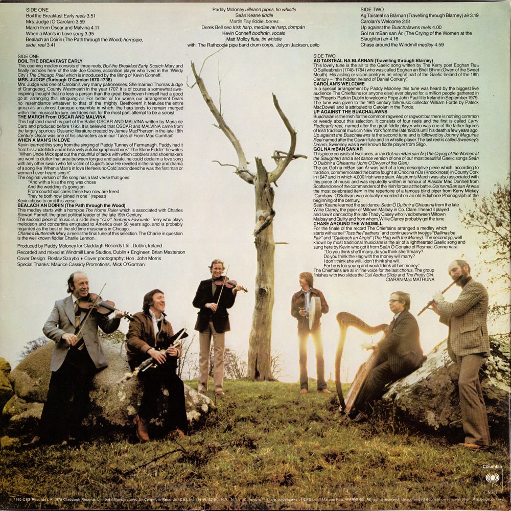 CHASE AROUND THE WINDMILL — For the finale of the record The Chieftains arranged a medley which starts with a reel "Toss the Feathers" and continues with two jigs "Ballinasloe Fair" and "Cailleach an Airgid" (The Hag with the Money). The second jig, well known by most traditional musicians is the air of a lighthearted Gaelic song and sung here by Kevin who got it from Seán Ó Conaire of Rosmuc, Connemara.