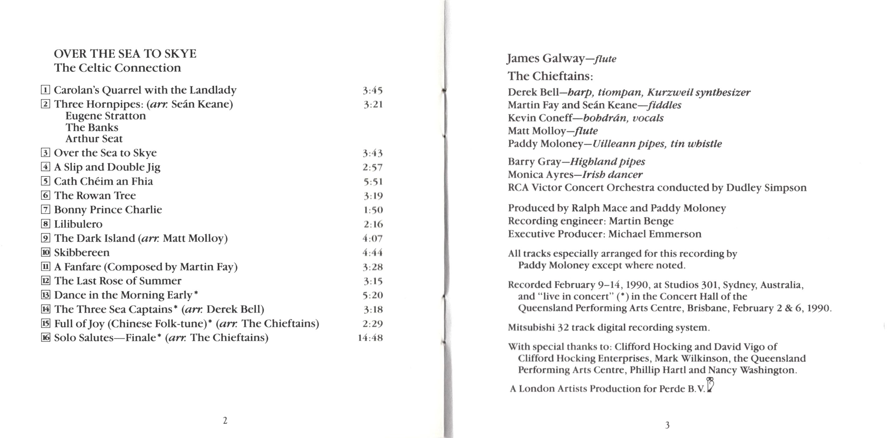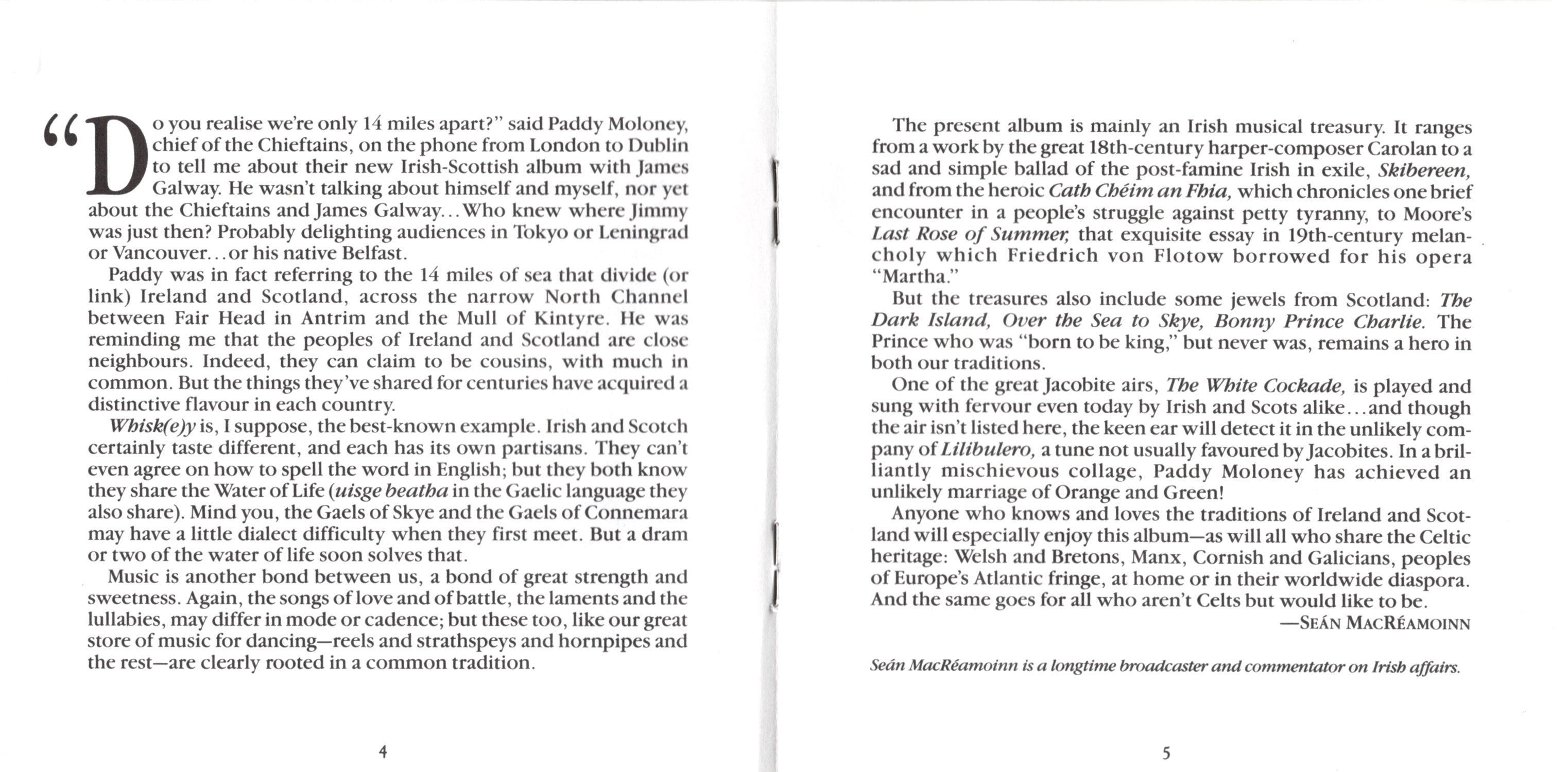 The present album is mainly an Irish musical treasury. It ranges from a work by the great 18th-century harper-composer Carolan to a sad and simple ballad of the post-famine Irish in exile, Skibereen, and from the heroic Cath Chéim an Fhia, which chronicles one brief encounter in a people's struggle against petty tyranny, to Moore's Last Rose of Summer, that exquisite essay in 19th-century melancholy which Friedrich von Flotow borrowed for his opera Martha."