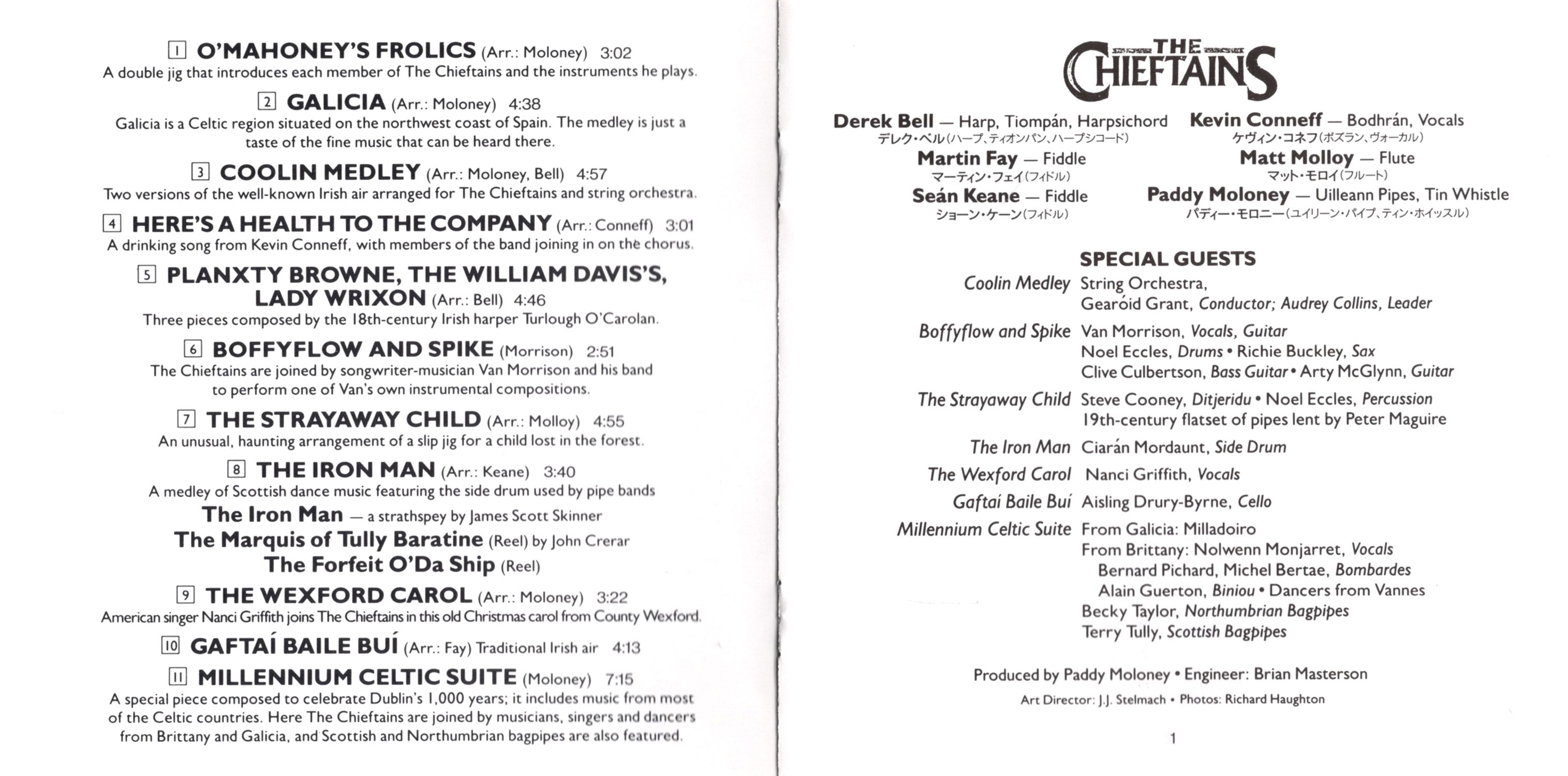 Millennium Celtic Suite — A special piece composed to celebrate Dublin's 1,000 years; it includes music from most of the Celtic countries. Here The Chieftains are joined by musicians, singers and dancers from Brittany and Galicia, and Scottish and Northumbrian bagpipes are also featured.