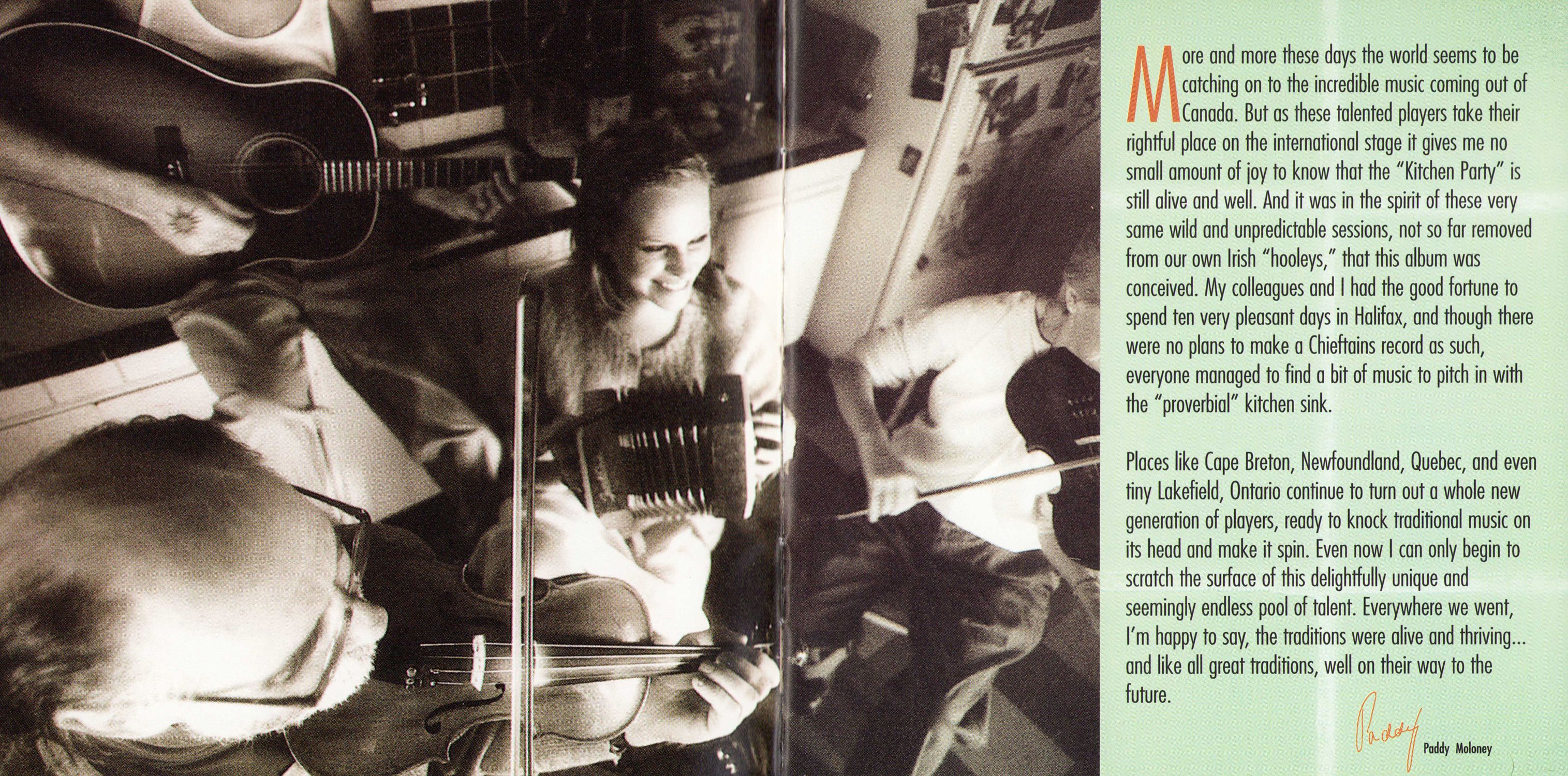 More and more these days the world seems to be catching on to the incredible music coming out of Canada. But as these talented players take their rightful place on the international stage it gives me no small amount of joy to know that the "Kitchen Party" is still alive and well. And it was in the spirit of these very same wild and unpredictable sessions, not so far removed from our own Irish "hooleys," that this album was conceived. My colleagues and I had the good fortune to spend ten very pleasant days in Halifax, and though there were no plans to make a Chieftains record as such, everyone managed to find a bit of music to pitch in with the "proverbial" kitchen sink.