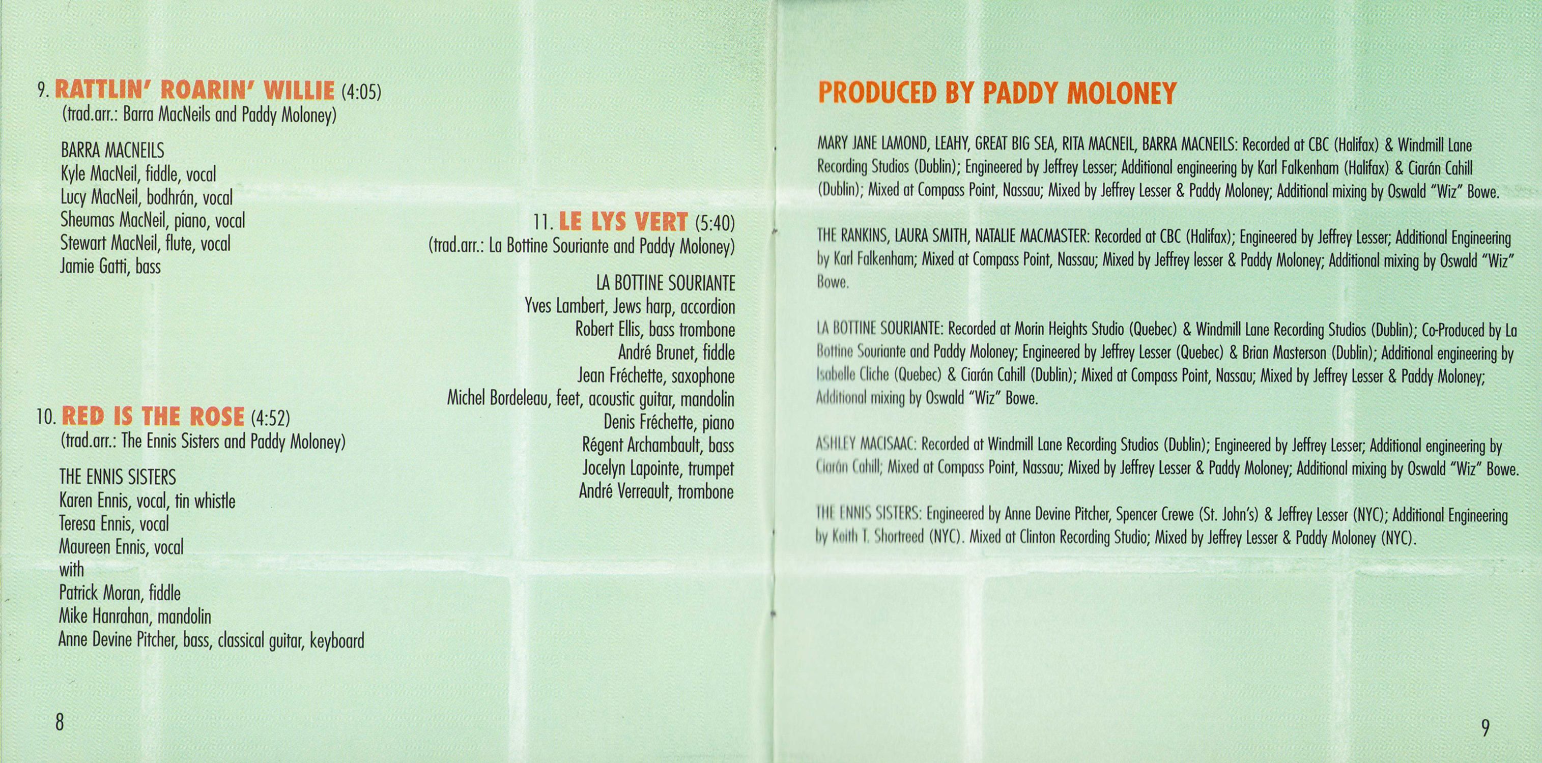 - Mary Jane Lamond, Leahy, Great Big Sea, Rita MacNeil, Barra MacNeils: Recorded at CBC (Halifax) & Windmill Lane Recording Studios (Dublin)