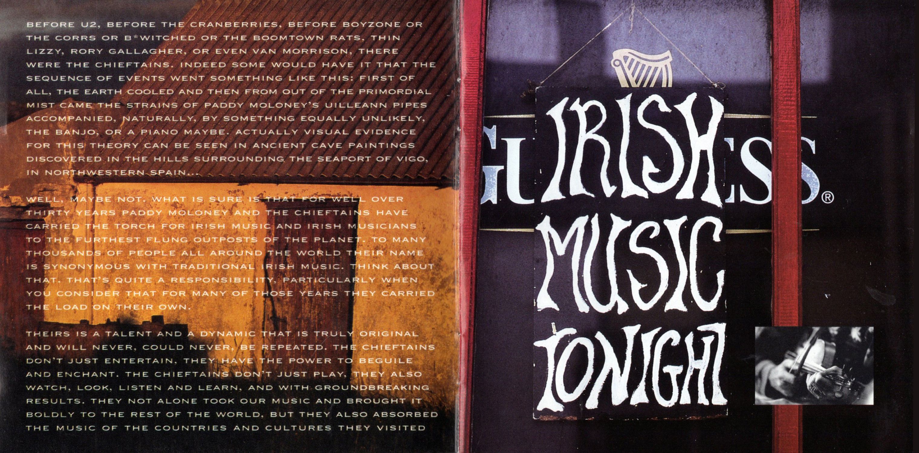 Before U2, before the Cranberries, before boyzone or The Corrs or B*witched or the Boomtown rats. Thin Lizzy, Rory Gallagher, or even Van Morrison, there were the Chieftains. Indeed some would have it that the sequence of events went something like this: first of all, the earth cooled and then from out of the primordial mist came the strains of Paddy Moloney's uilleann pipes accompanied, naturally, by something equally unlikely, the banjo, or a piano maybe. Actually visual evidence for this theory can be seen in ancient cave paintings discovered in the hills surrounding the seaport of vigo, in Northwestern Spain …