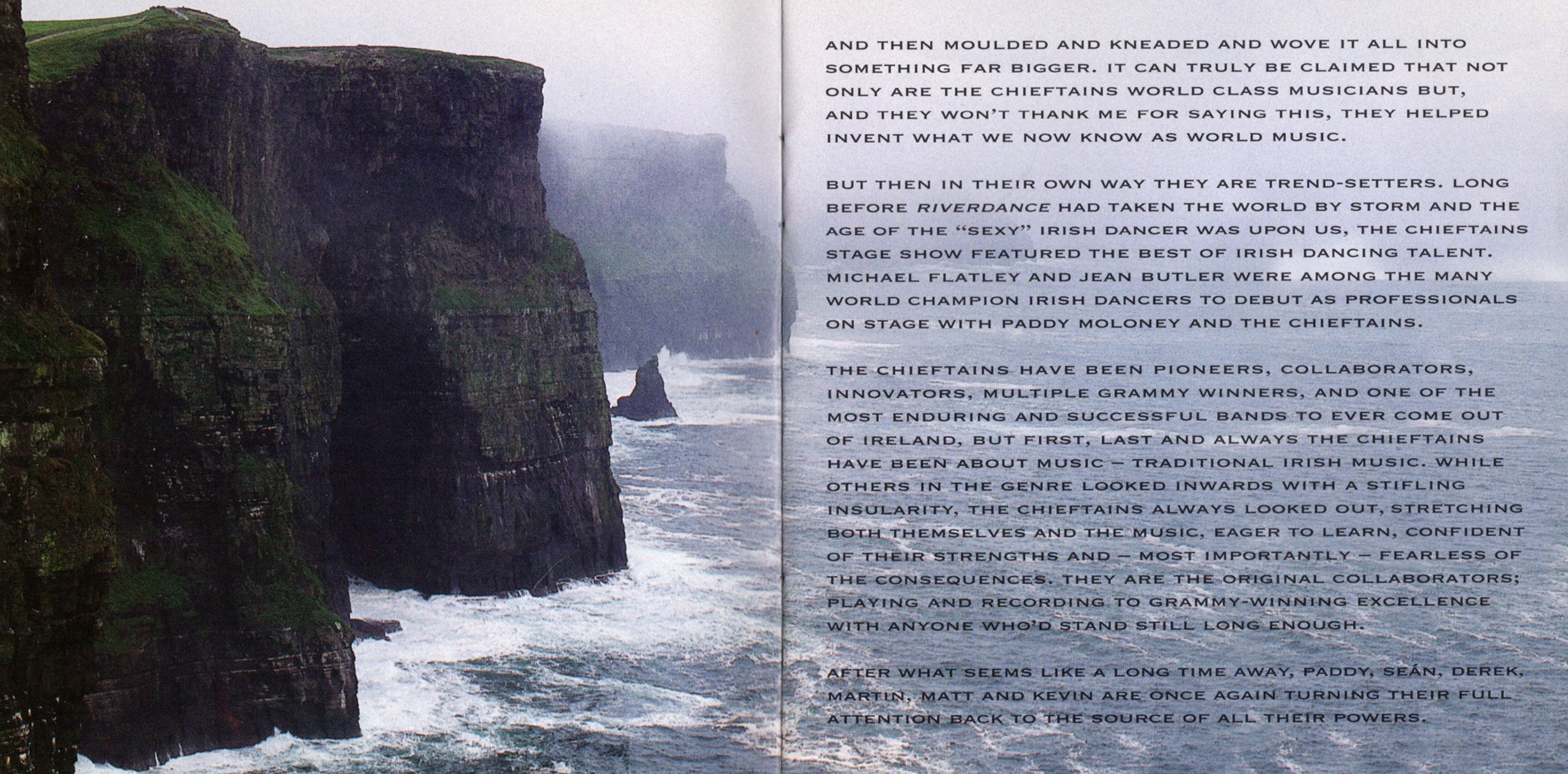Well, maybe not. What is sure is that for well over thirty years Paddy Moloney and the Chieftains have carried the torch for irish music and irish musicians to the furthest flung outposts of the planet. To many thousands of people all around the world their name is synonymous with traditional irish music. Think about that. That's quite a responsibility. Particularly when you consider that for many of thoose years they carried the load on their own.