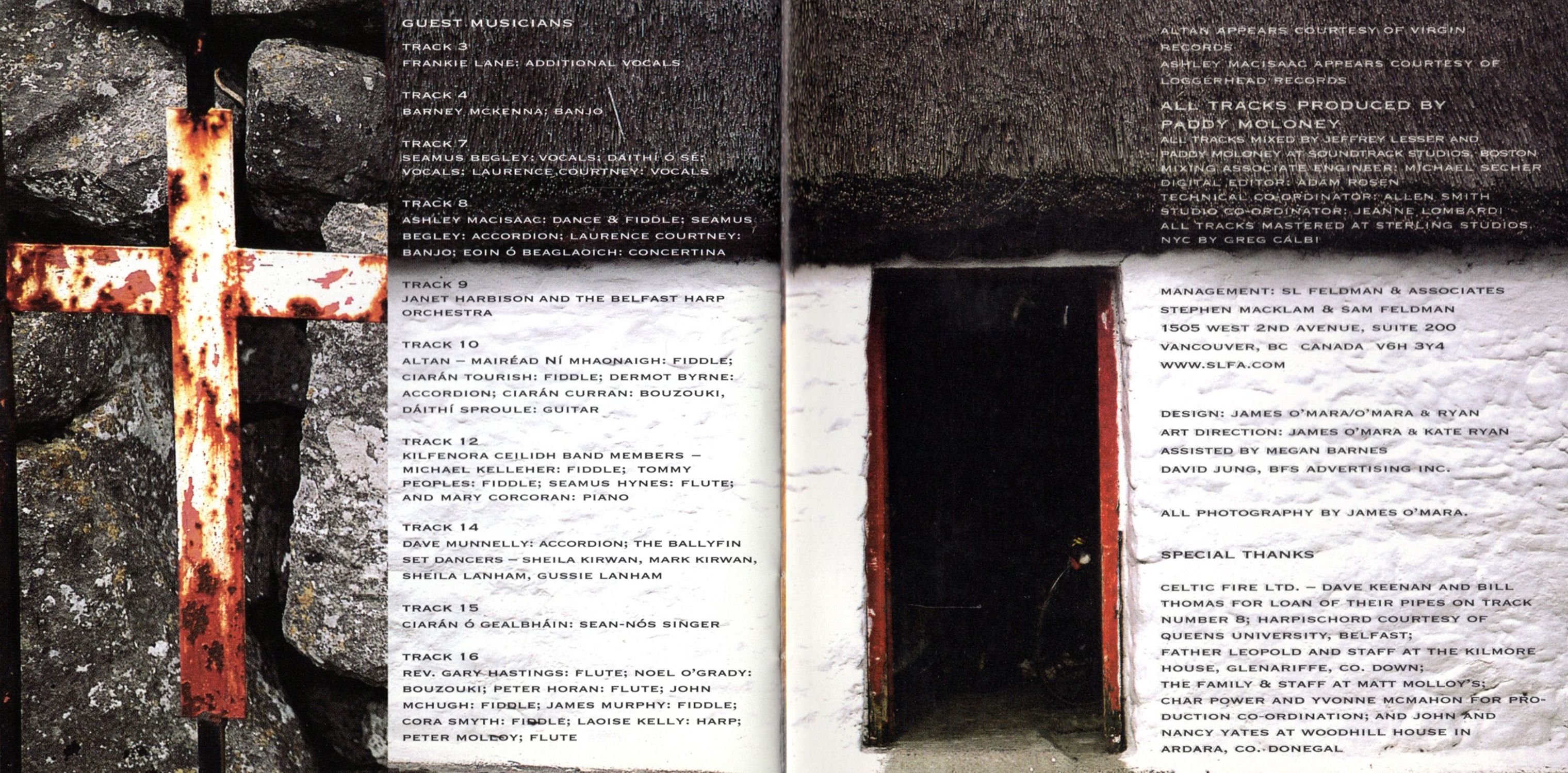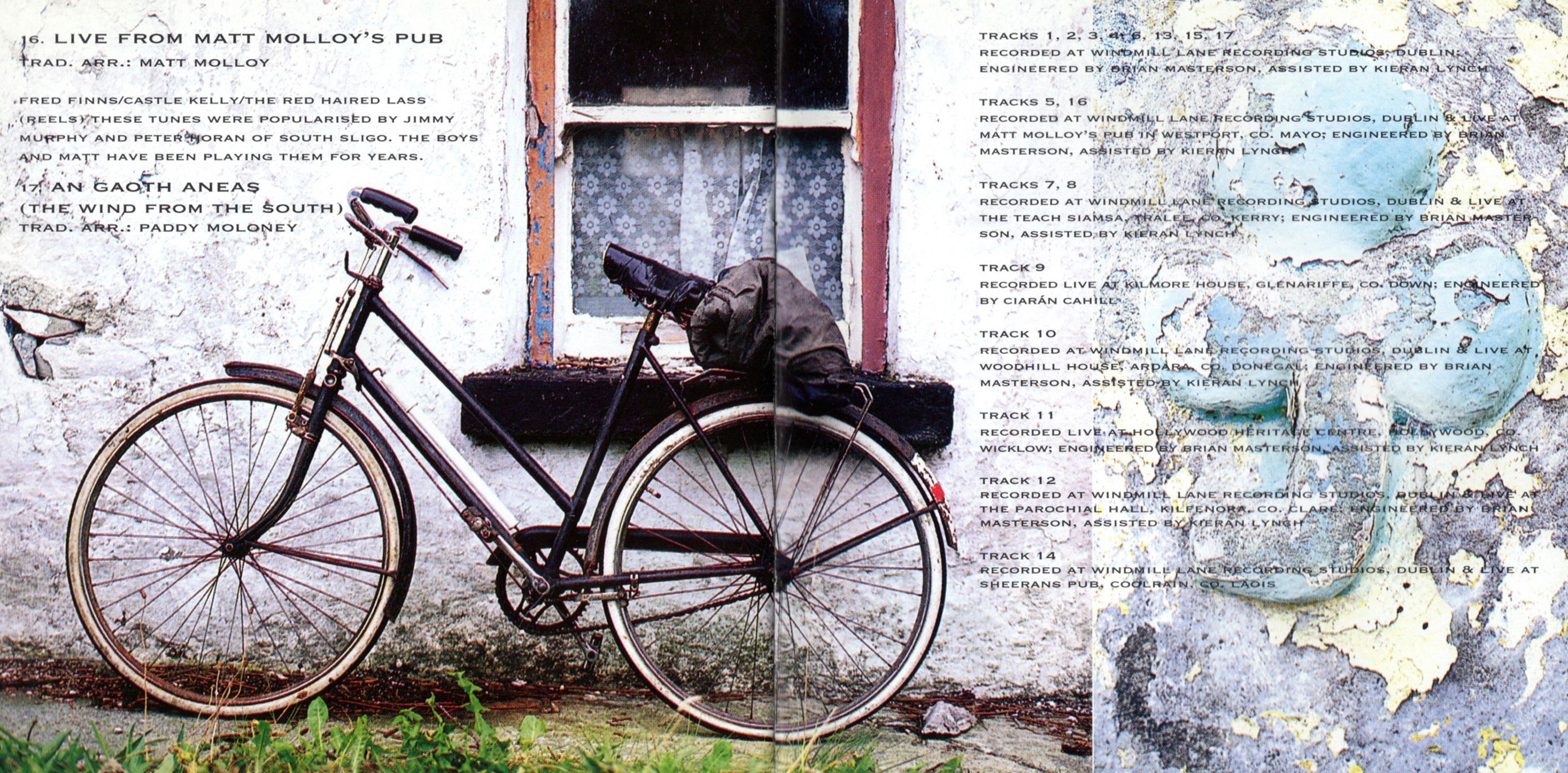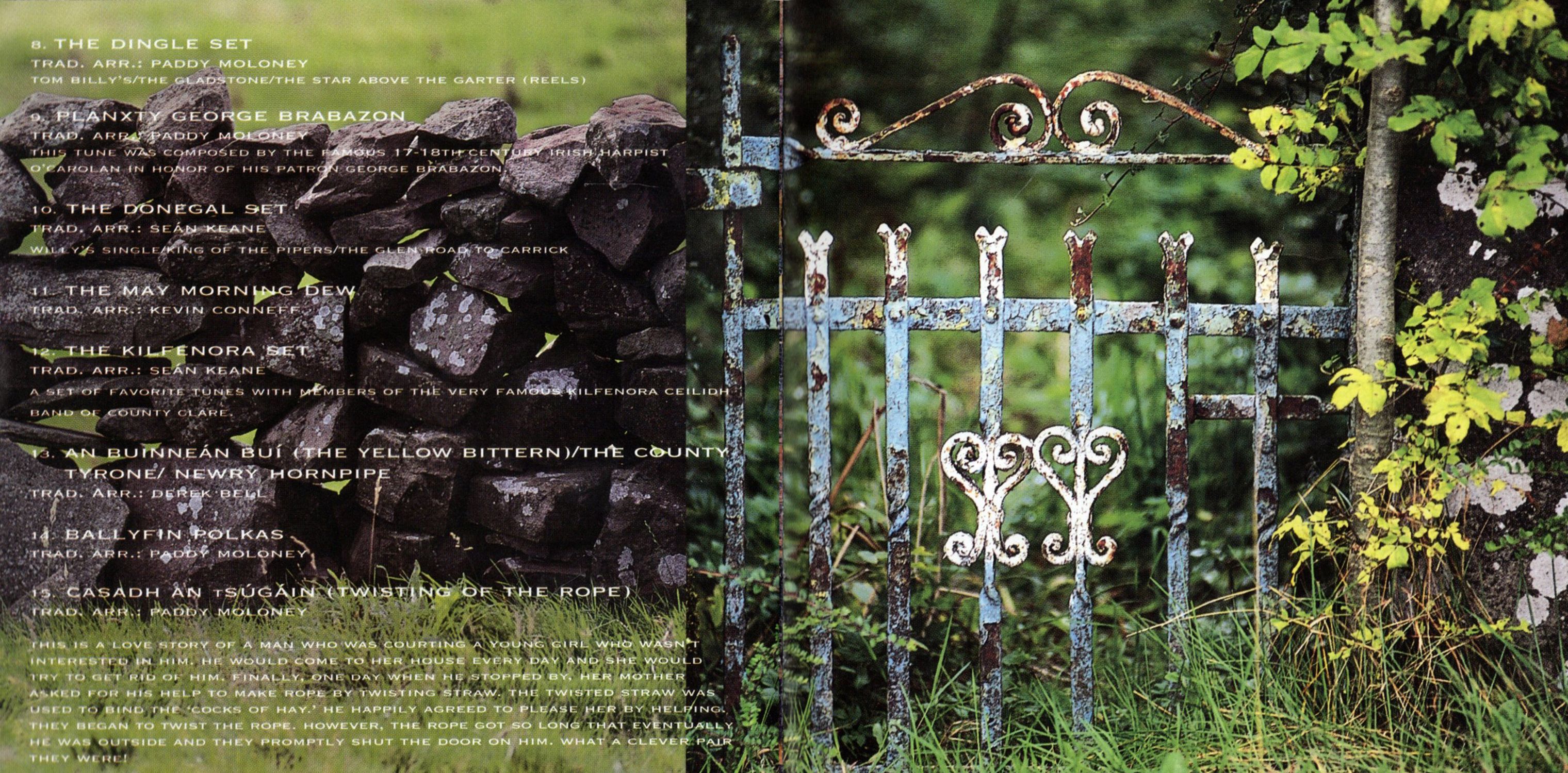 Ry Cooder said, "Irish music has always been intensely pictorial. Constantly throwming up images to the listender." You can't really argue with that. Irish music is visual. It's tactile. You can feel it. You can smell it it. It's all around you. Irish music is earthy. Irish music is of the people and of the land. It's full of life and emotion. It's exciting. It' moving. It lives and breathes. To best understand that, you need to stand. Like I did and watch it happen right in from of you: in Matt Molloy's Pub in Westport with four flutes, five fiddles, one bouzouki and the irrepressible pipes — there were even two harps for God's sake; in the community hall in Kilfenora with a sprinkling of the famous Ceilidh Band; in Dingle with copious singers and squeeze boxes; in Laois with the set dancers; in th Glens of Antrim with another twelve harper — what is it with the harpers?; in Donegal with the one and only Altan. What did I learn? That if music is a language then Irish music has as many dialects as it has townlands and parishes what did I witness? A remarkable group making a remarkable album.