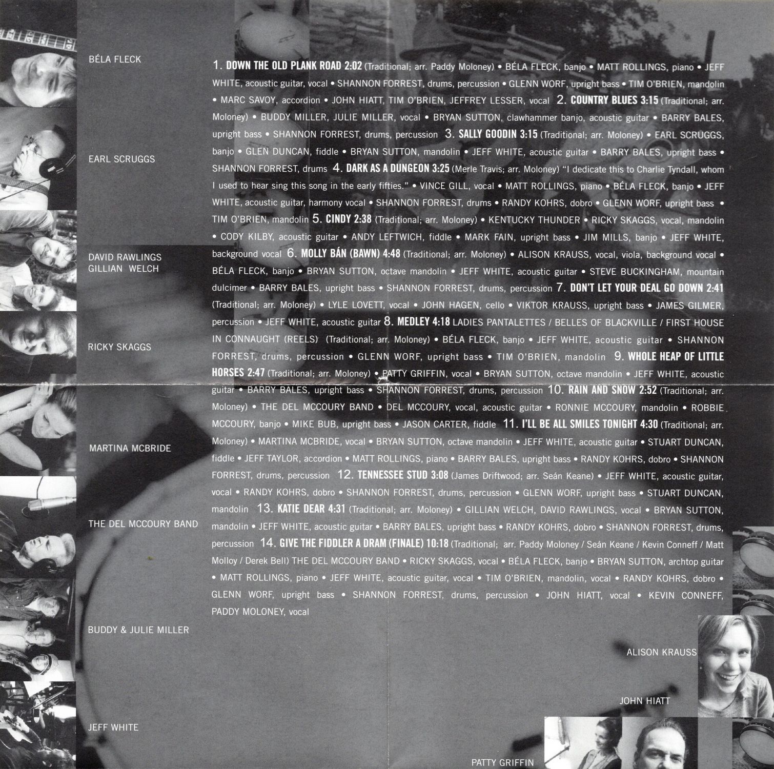 BLUEGRASS STARS DEL MCCOURY AND JEFF WHITE find a new kind of "high and lonesome" here. Instrumentalists Bela Fleck, Ricky Skaggs and Earl Scruggs lean toward the Celtic and The Chieftains lean toward the country for some stunning collaborations. Troubadours John Hiatt, Lyle Lovett, Patty Griffin and Buddy & Julie Miller come from various points on the musical compass, but all melt comfortably into the fusion sound created when the Emerald Isle meets America. Meanwhile. Alison Krauss and Gillian Welch & David Rawlings sound as if they've been strolling on the seaside rocks of Donegal all their lives.