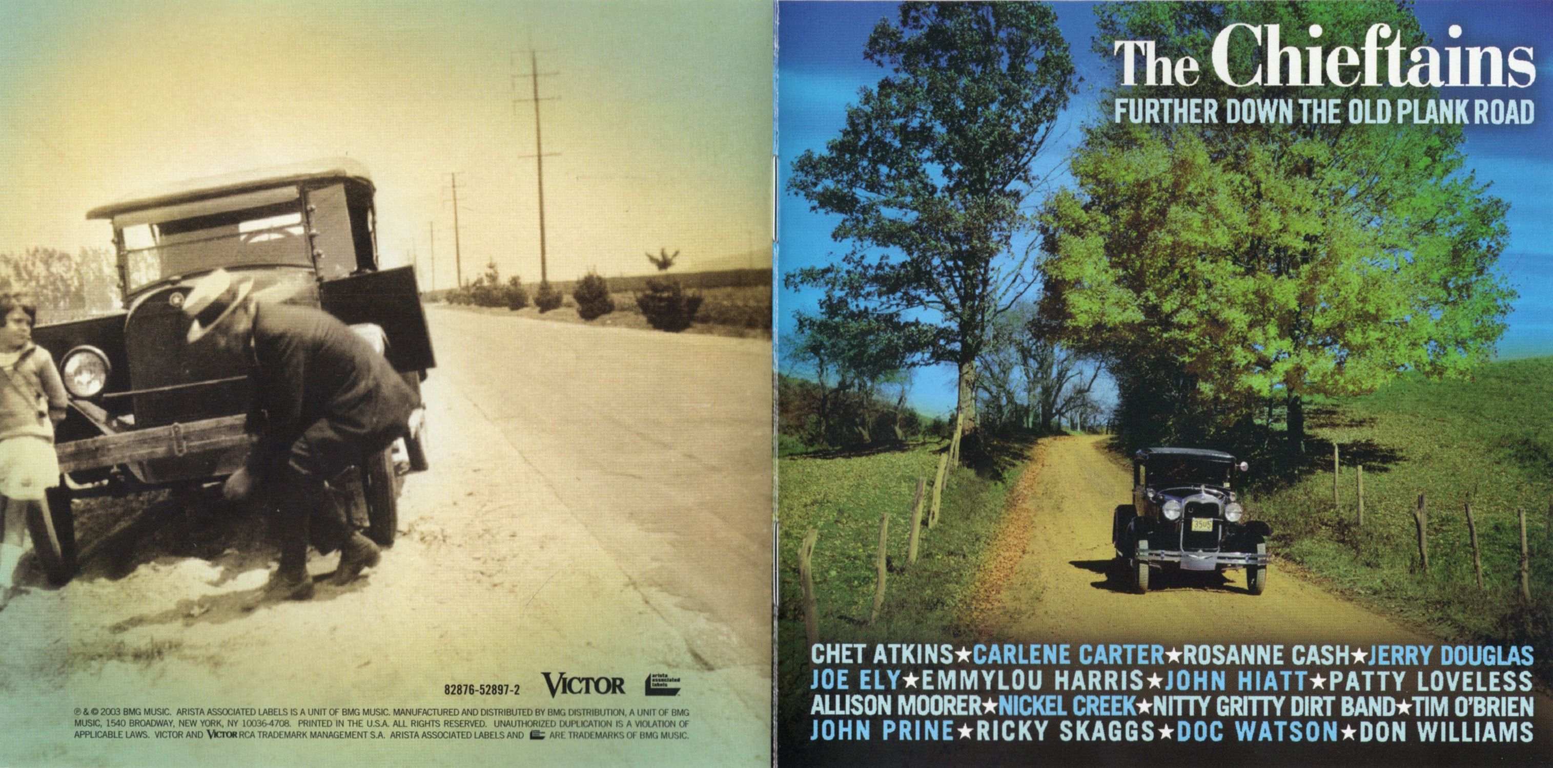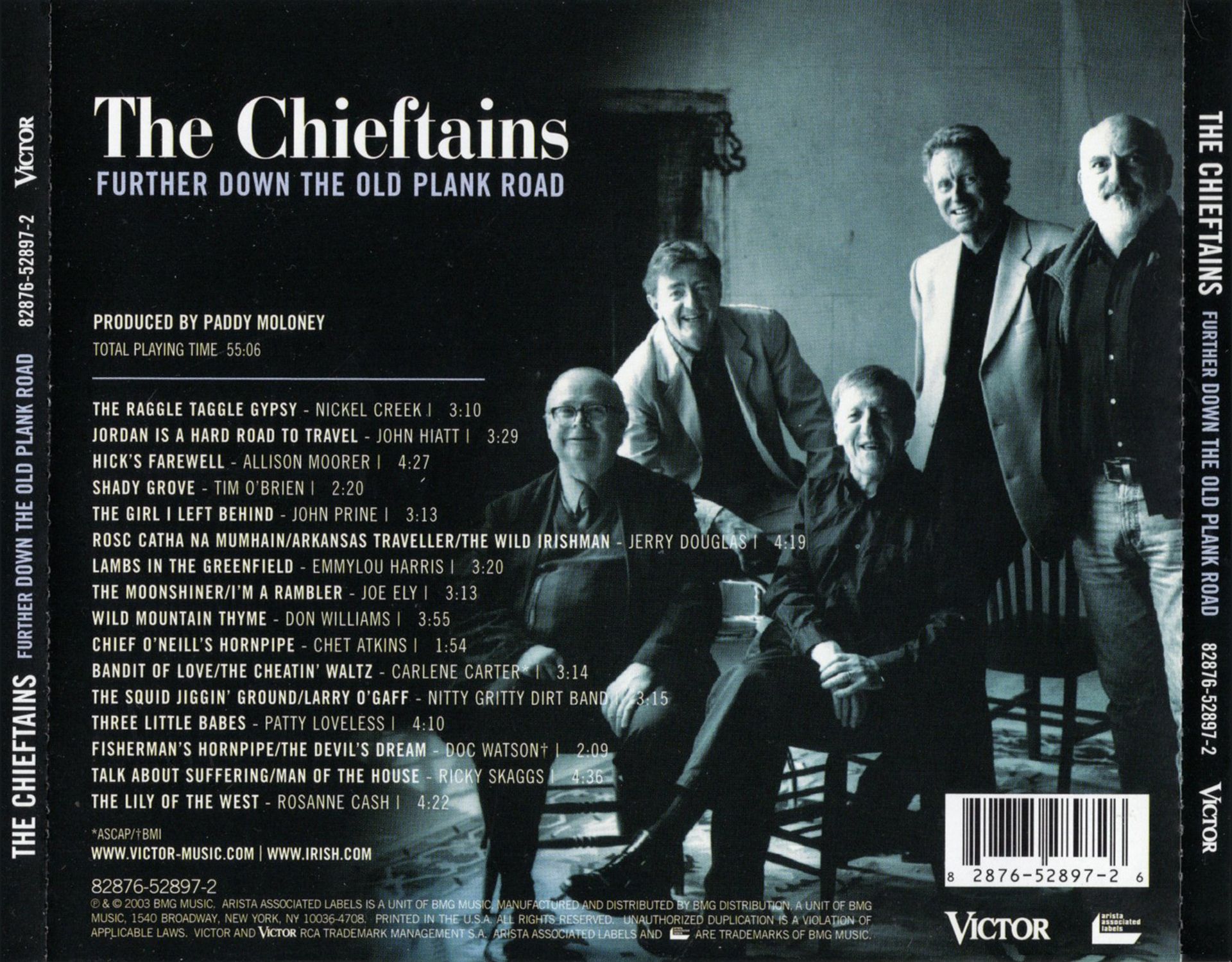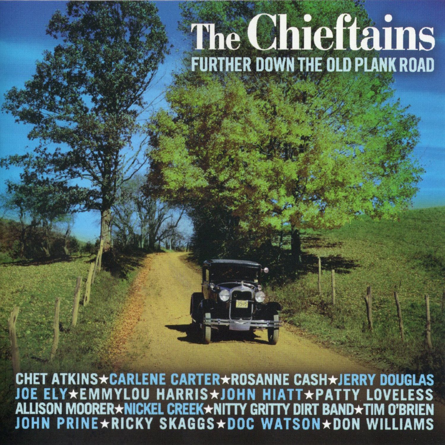The merry Nitty Gritty Dirt Band collaboration here is "The Squid Jiggin' Ground," a ditty that apparently originated in Newfoundland, Canada to the tune of the Irish jig "Larry O'Gaff." The newest song on Further Down the Old Plank Road is Carlene Carter's sprightly "Bandit of Love" It appeared initially on her visionary 1980 LP Musical Shapes. The Chieftains pair her performance with their own "The Cheatin' Waltz."