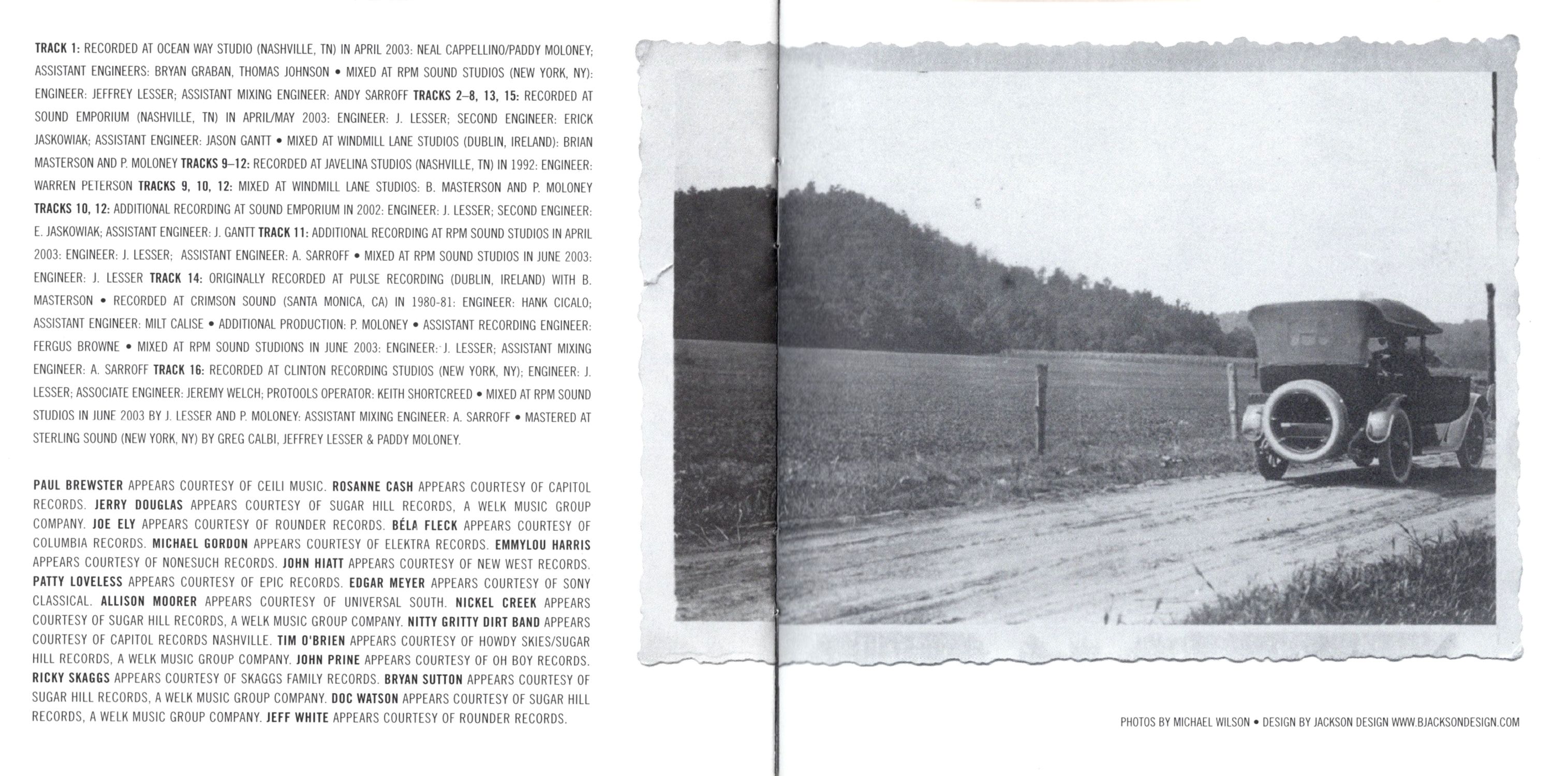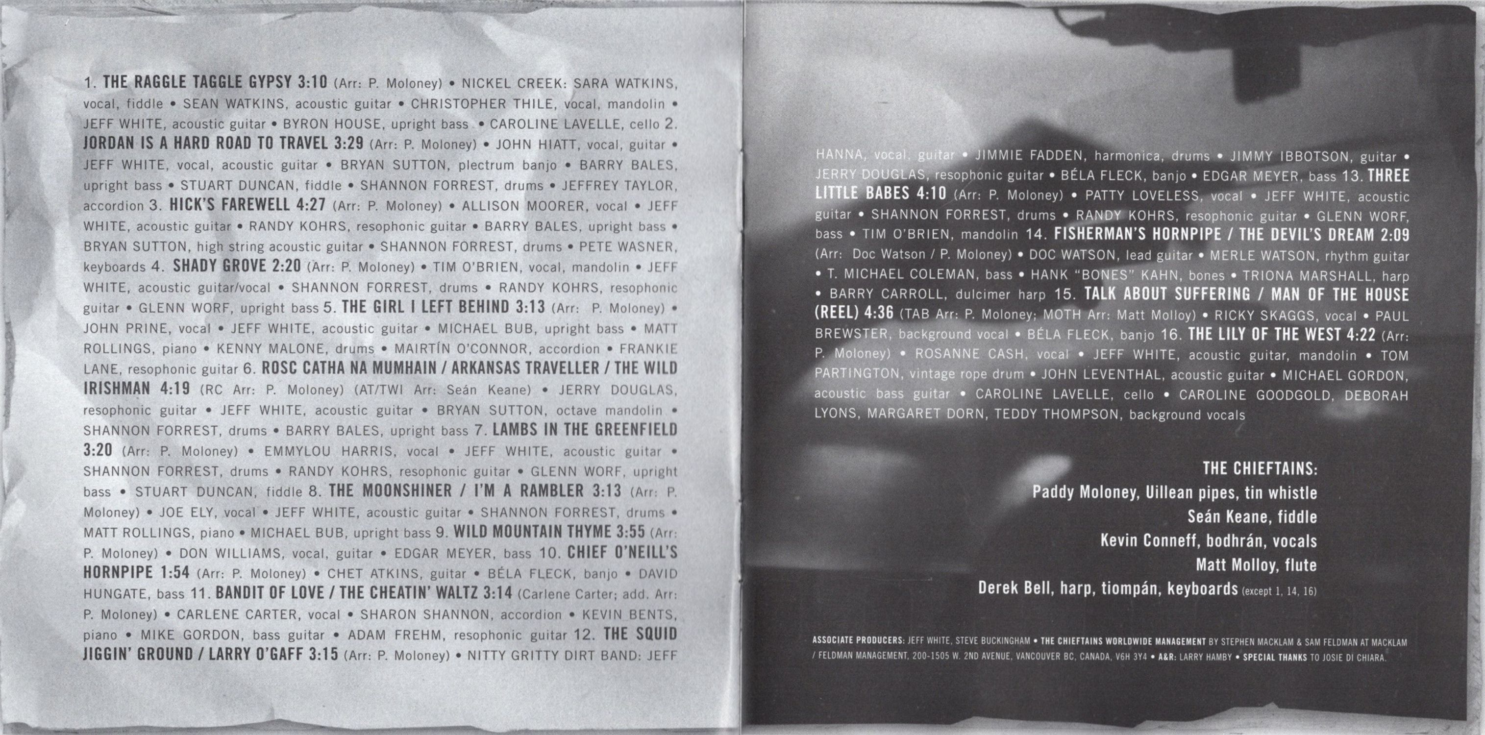 At the other end of the spectrum are songs that are practically as old as Ireland herself. The mountain wail of Patty Loveless conveys the anguish of "Three Little Babes." Sung throughout the Appalachian and Ozark Mountains in America, it is a variant of the ancient British/Irish song "The Wife of Usher's Well," known in folklore circles as Child Ballad #79. The song assigned Child Ballad #200 by folk scholars is sung in Ireland as "The Raggle Taggle Gypsy." Dating from at least 1720, it is also known variously as "Gypsy Laddie"and "Gypsy Rover," as well as by other titles. Few renditions are as moving as the one Nickel Creek presents here.
