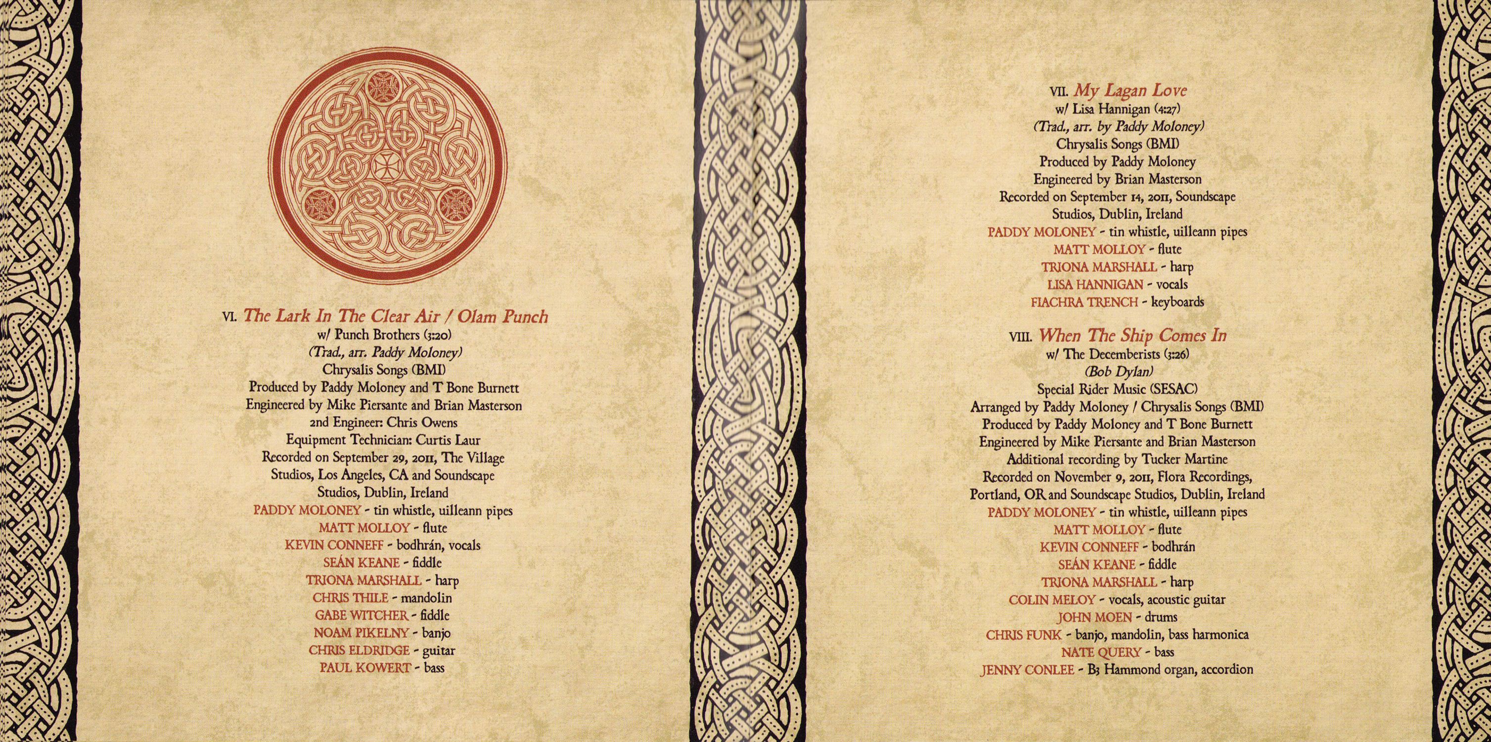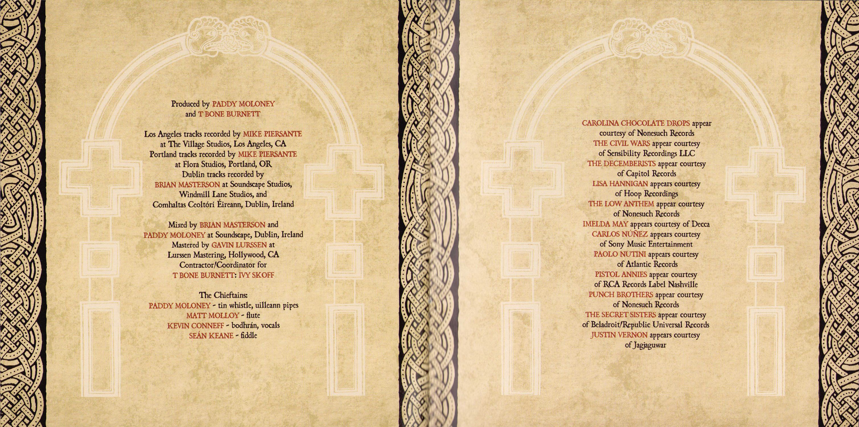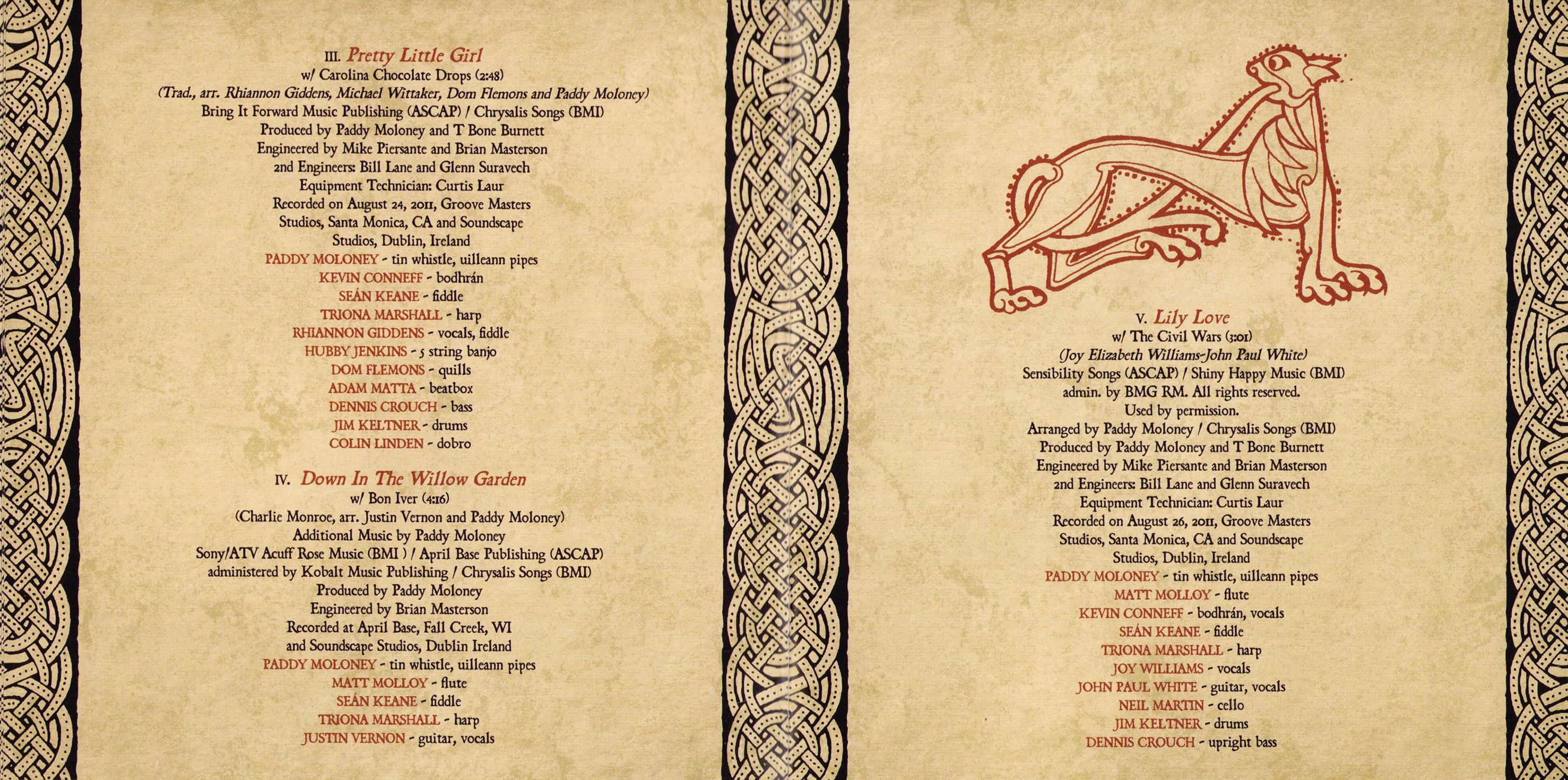 Thank yous: Bon Iver, Carolina Chocolate Drops, The Civil Wars, The Decemberists, Lisa Hannigan, The Low Anthem, Imelda May, Paolo Nutini, Pistol Annies, Punch Brothers, The Secret Sisters, Triona Marshall, Carlos Núñez, Van Dyke Parks, Cady Coleman, Castle Park School Choir, City of Limerick Pipe Band, Bernadette Barrett, Mike Bawden, Andrew Brightman, Emily Charles, Jason Colton, Marion Kraft, Kate Landau, Mike Luba, Brendan Moon, Hugh Phillmore, Dolphus Ramseur, Nate Vernon, Nate Yetton, T Bone Burnett, Larry Jenkins, Mike Piersante, Ruth Bennett, Vanessa Parr, Paul Ackling, Curtis Laur, Tucker Martine, Ivy Skoff, Comhaltas Ceoltoiri Eireann, Flora Studios, Lurssen Mastering, Soundscape Studios, The Village Studios, Windmill Lane Studios, Steve Macklam, Sam Feldman, Michelle Findlay, Alexandra Cleland, Kathleen Deas, Christian Macklam, Brian Masterson, Sarah Pidhirniak, Timothy Jones, Ron Kaplan