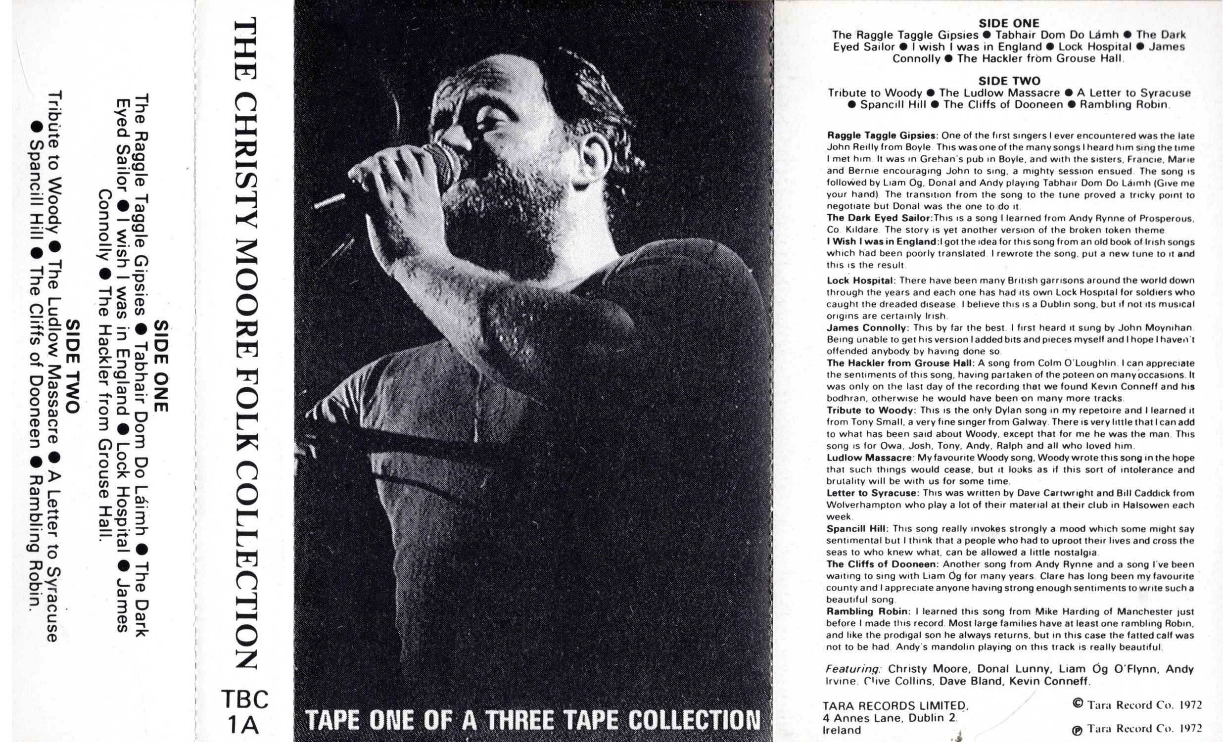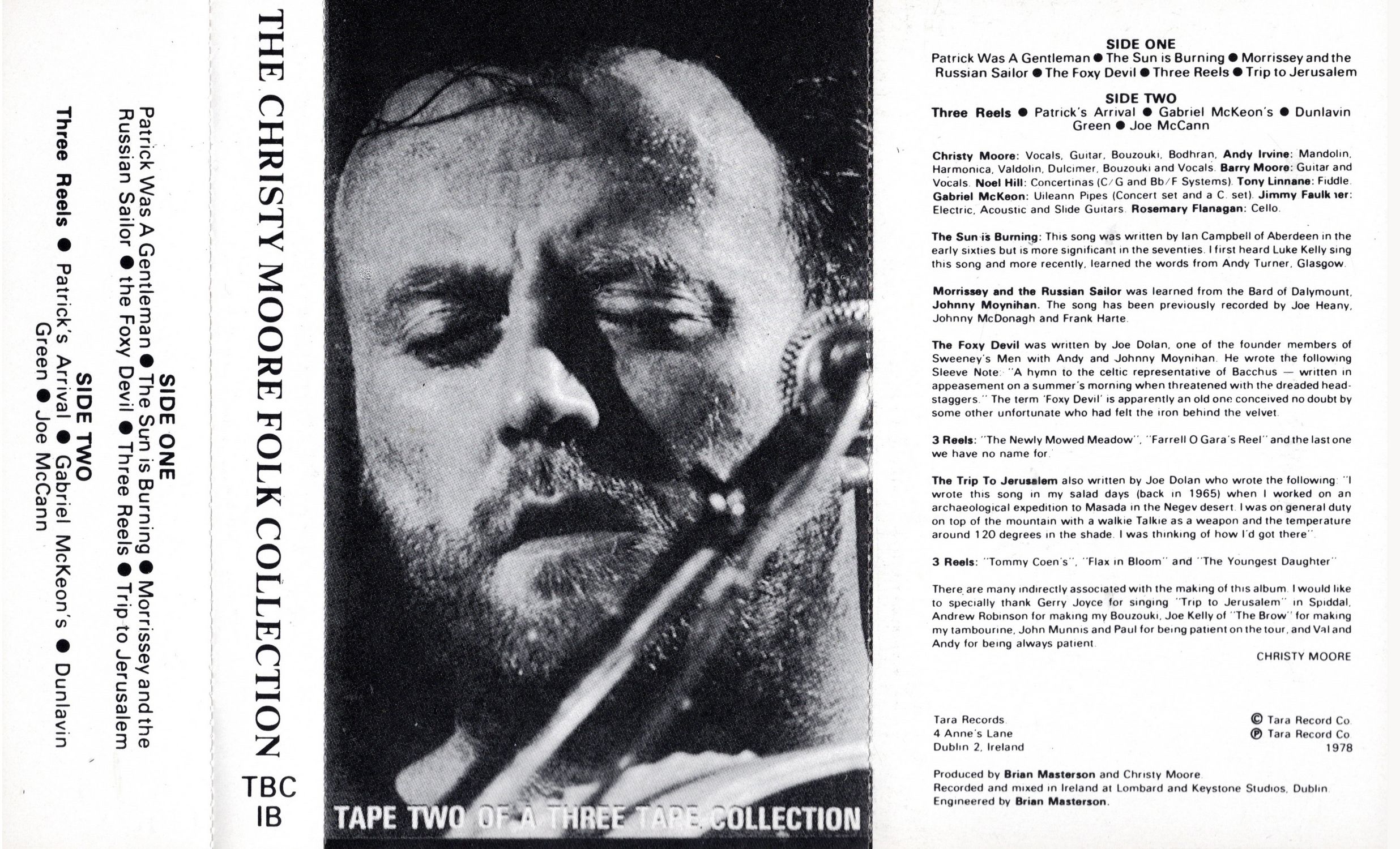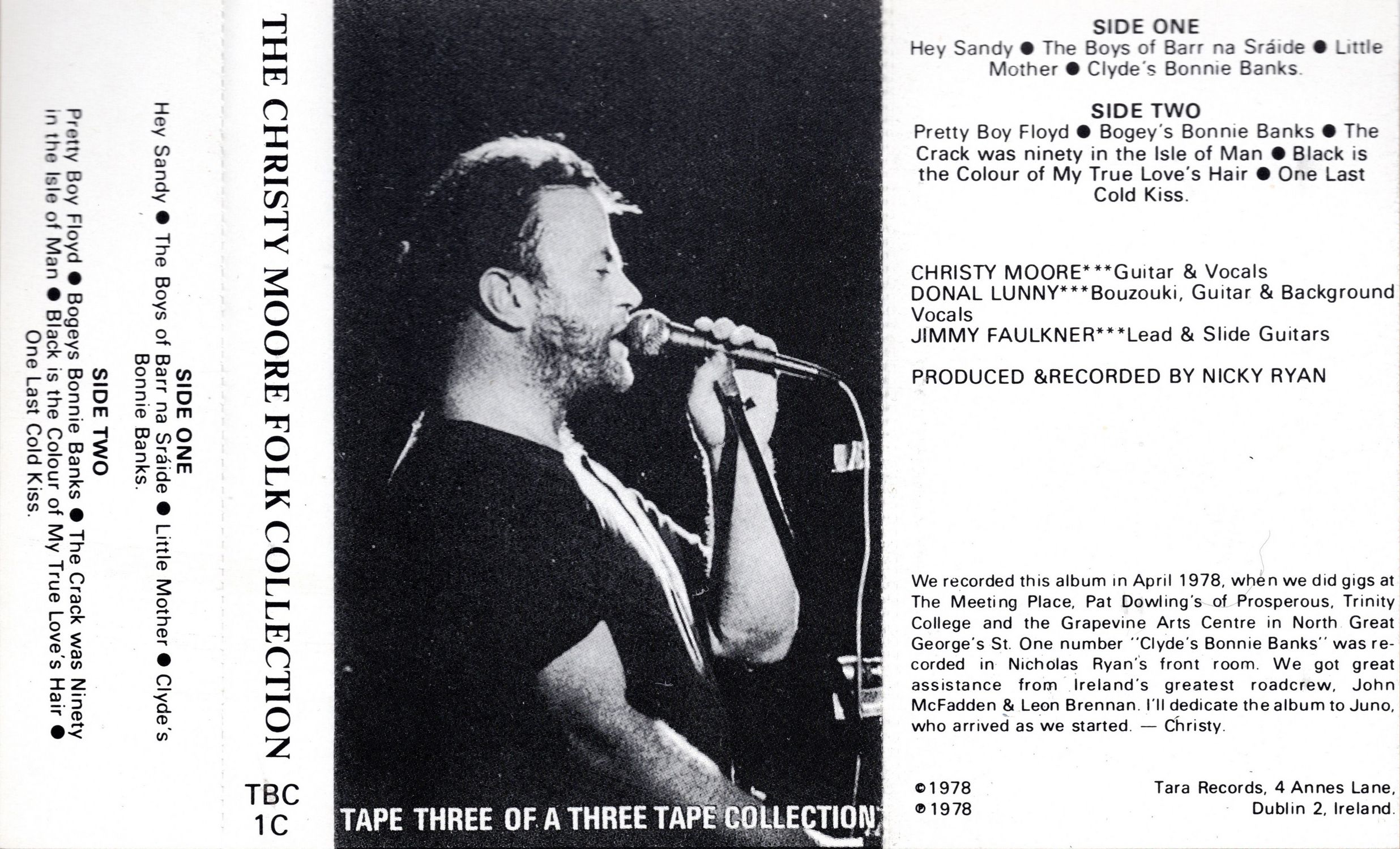We recorded this album in April 1978, when we did gigs at The Meeting Place, Pat Dowling's of Prosperous, Trinity College and the Grapevine Arts Centre in North Great George's St. One number "Clyde's Bonnie Banks" was recorded in Nicholas Ryan's front room. We got great assistance from Ireland's greatest roadcrew, John McFadden & Leon Brennan. I'll dedicate the album to Juno, who arrived as we started. — Christy.