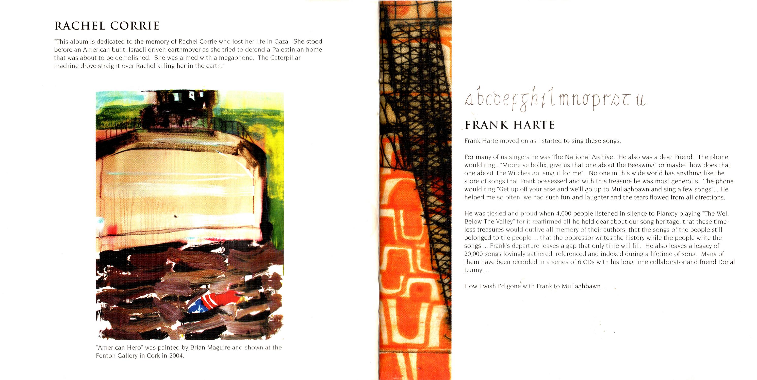 "This album is dedicated to the memory of Rachel Corrie who lost her life in Gaza. She stood before an American built, Israeli driven earthmover as she tried to defend a Palestinian home that was about to be demolished. She was armed with a megaphone. The Caterpillar machine drove straight over Rachel killing her in the earth."