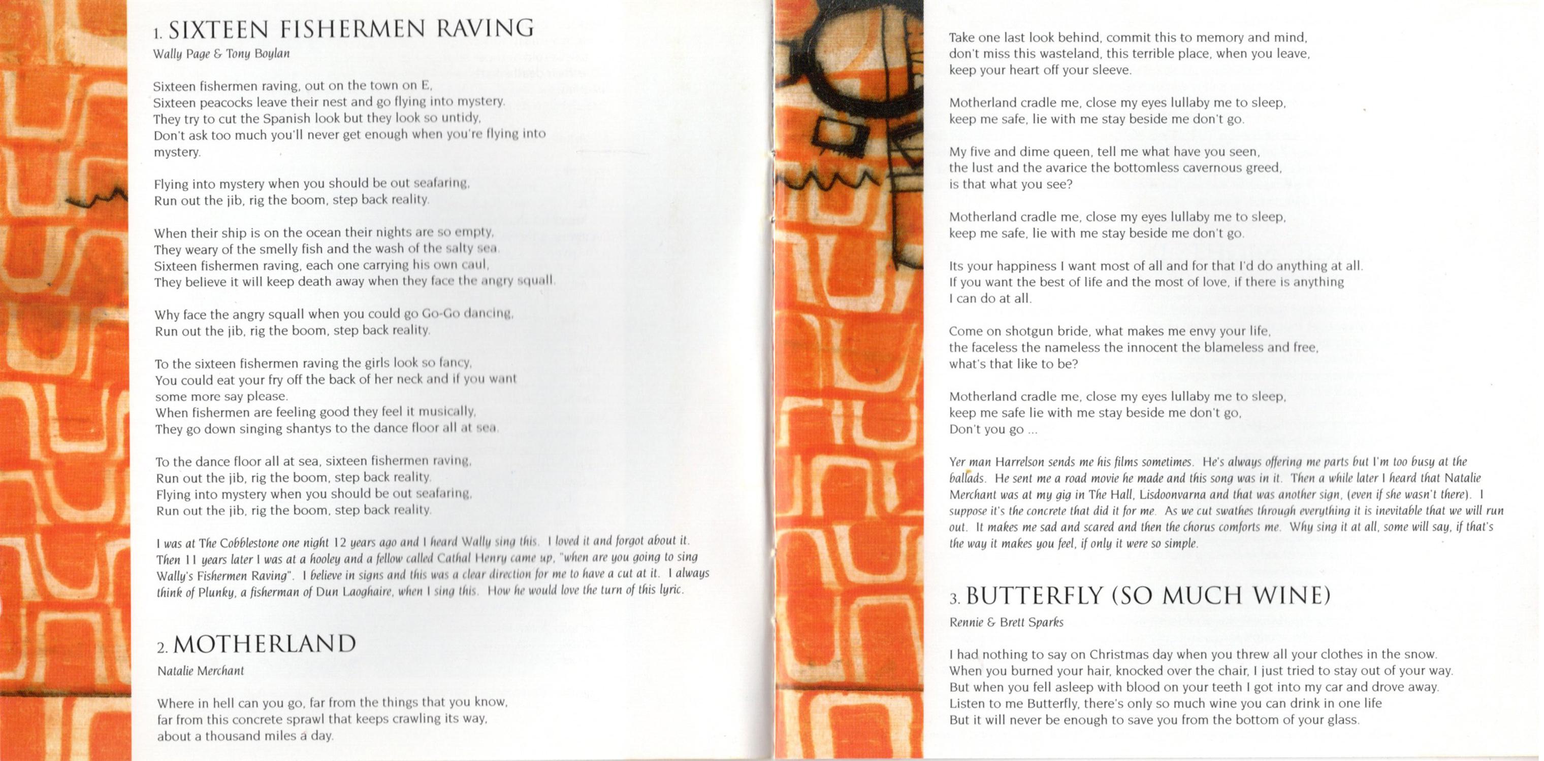 Motherland — Yer man Harrelson sends me his films sometimes. He's always offering me parts but I'm too busy at the ballads. He sent me a road movie he made and this song was in it. Then a while later I heard that Natalie Merchant was at my gig in The Hall, Lisdoonvarna and that was another sign, (even if she wasn't there). I suppose it's the concrete that did it for me. As we cut swathes through everything it is inevitable that we will run out. It makes me sad and scared and then the chorus comforts me. Why sing it at all, some will say, if that's the way it makes you feel, if only it were so simple.