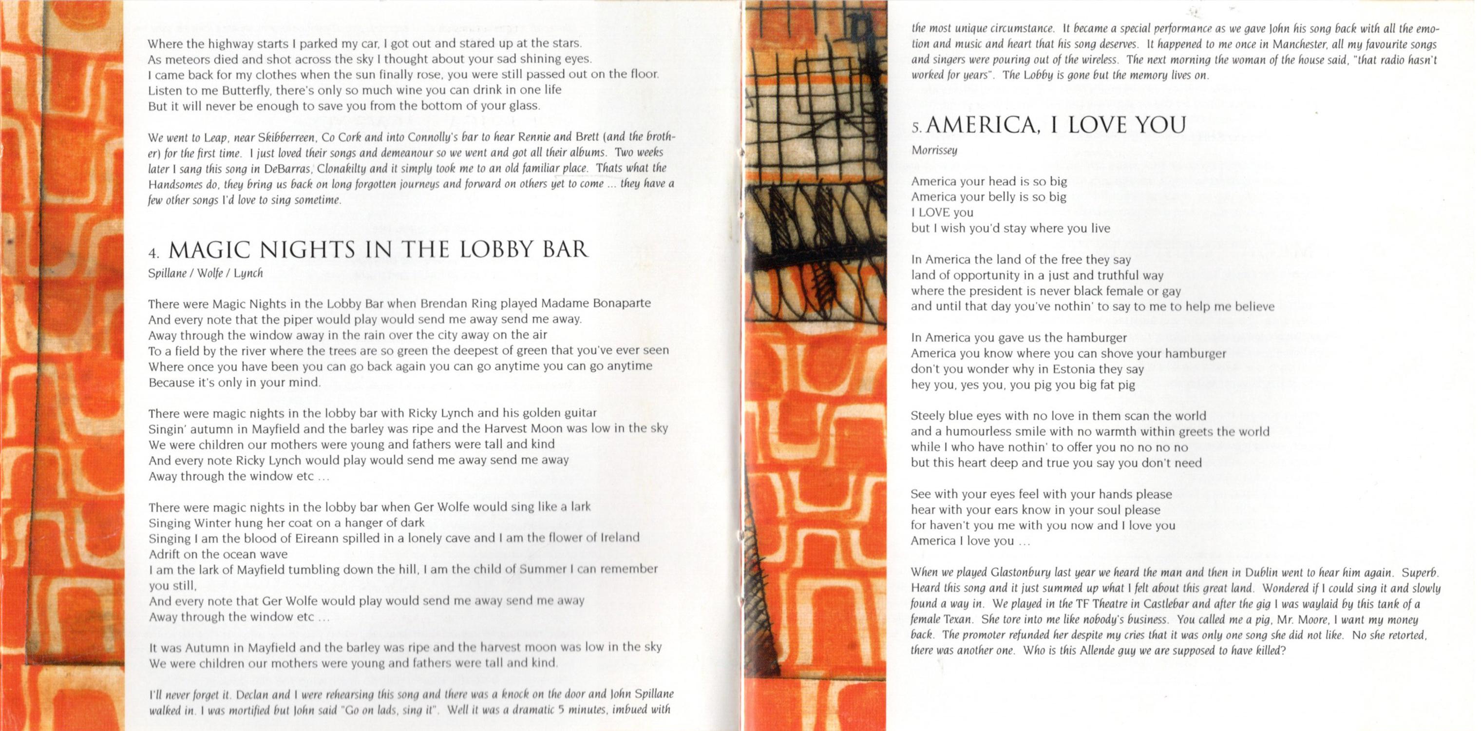 America, I Love You — When we played Glastonbury last year we heard the man and then in Dublin went to hear him again. Superb. Heard this song and it just summed up what I felt about this great land. Wondered if I could sing it and slowly found a way in. We played in the TF Theatre in Castlebar and after the gig I was waylaid by this tank of a female Texan. She tore into me like nobody's business. You called me a pig, Mr. Moore, I want my money back. The promoter refunded her despite my cries that it was only one song she did not like. No she retorted, there was another one. Who is this Allende guy we are supposed to have killed?