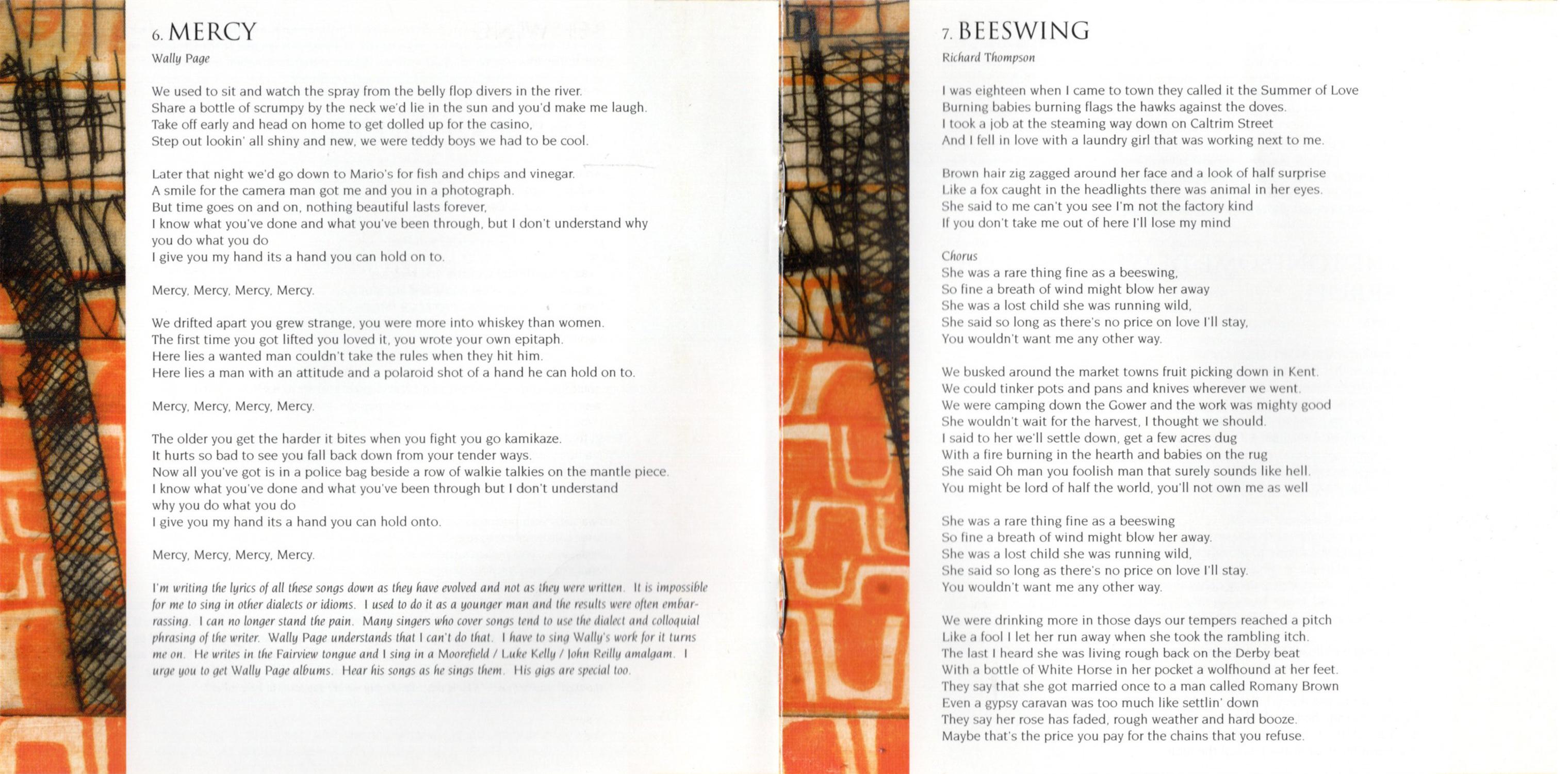 Mercy — I'm writing the lyrics of all these songs down as they have evolved and not as they were written. It is impossible for me to sing in other dialects or idioms. I used to do it as a younger man and the results were often embarrassing. I can no longer stand the pain. Many singers who cover songs tend to use the dialect and colloquial phrasing of the writer. Wally Page understands that I can't do that. I have to sing Wally's work for it turns me on. He writes in the Fairview tongue and I sing in a Moorefield / Luke Kelly / John Reilly amalgam. I urge you to get Wally Page albums. Hear his songs as he sings them. His gigs are special too.