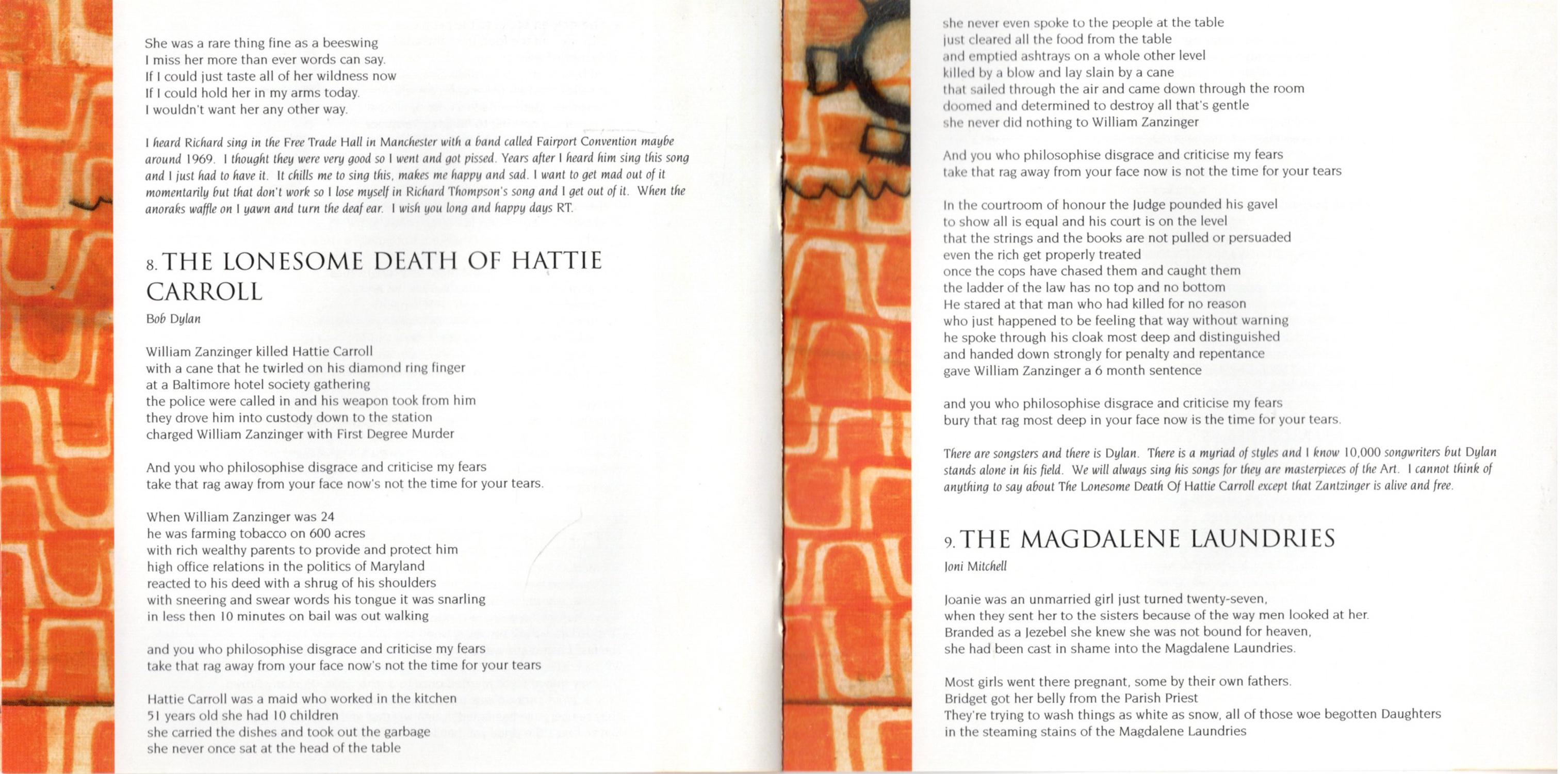 Beeswing — I heard Richard sing in the Free Trade Hall in Manchester with a band called Fairport Convention maybe around 1969. I thought they were very good so I went and got pissed. Years after I heard him sing this song and I just had to have it. It chills me to sing this, makes me happy and sad. I want to get mad out of it momentarily but that don't work so I lose myself in Richard Thompson's song and I get out of it. When the anoraks waffle on I yawn and turn the deaf ear. I wish you long and happy days RT.
