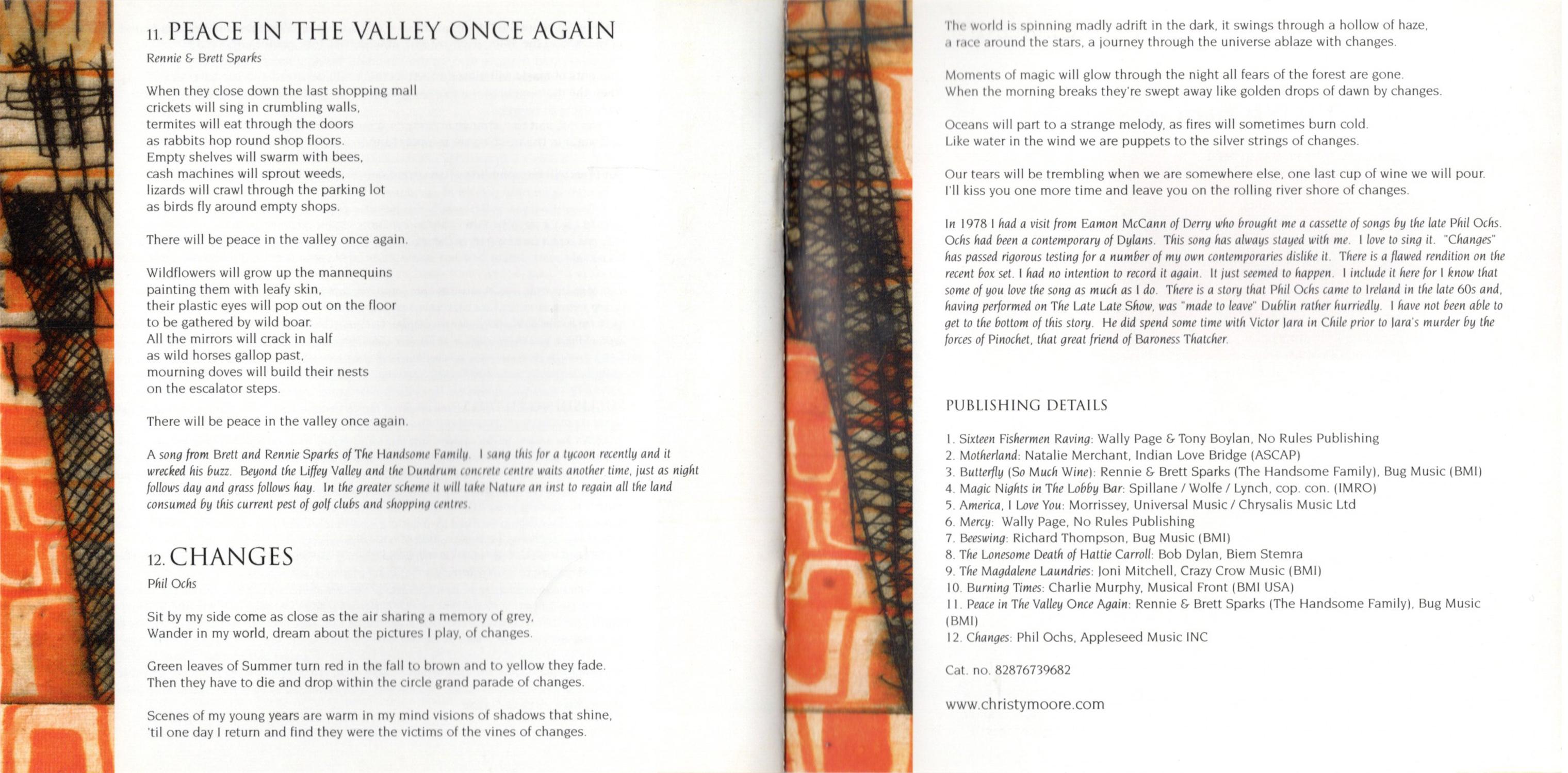 Changes — In 1978 I had a visit from Eamon McCann of Derry who brought me a cassette of songs by the late Phil Ochs. Ochs had been a contemporary of Dylans. This song has always stayed with me. I love to sing it. "Changes" has passed rigorous testing for a number of my own contemporaries dislike it. There is a flawed rendition on the recent box set. I had no intention to record it again. It just seemed to happen. I include it here for I know that some of you love the song as much as I do. There is a story that Phil Ochs came to Ireland in the late 60s and, having performed on The Late Late Show, was "made to leave" Dublin rather hurriedly. I have not been able to get to the bottom of this story. He did spend some time with Victor Jara in Chile prior to Jara's murder by the forces of Pinochet, that great friend of Baroness Thatcher.