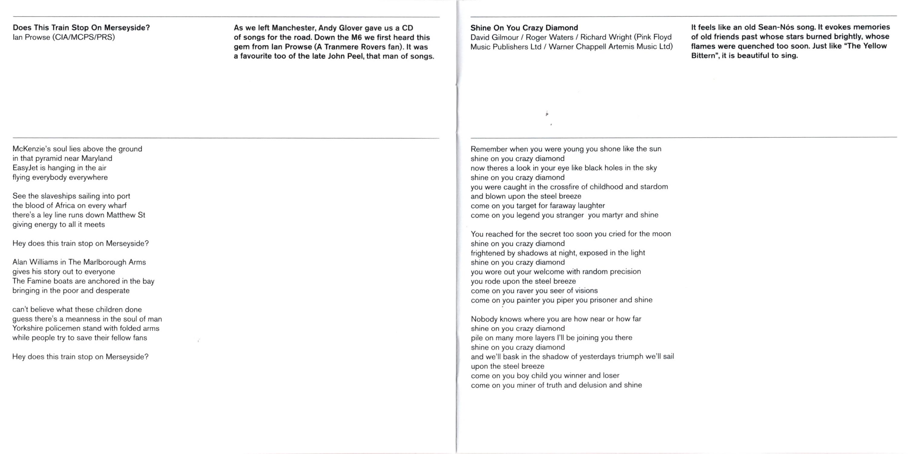 Does This Train Stop On Merseyside? — As we left Manchester, Andy Glover gave us a CD of songs for the road. Down the M6 we first heard this gem from Ian Prowse (A Tranmere Rovers fan). It was a favourite too of the late John Peel, that man of songs.