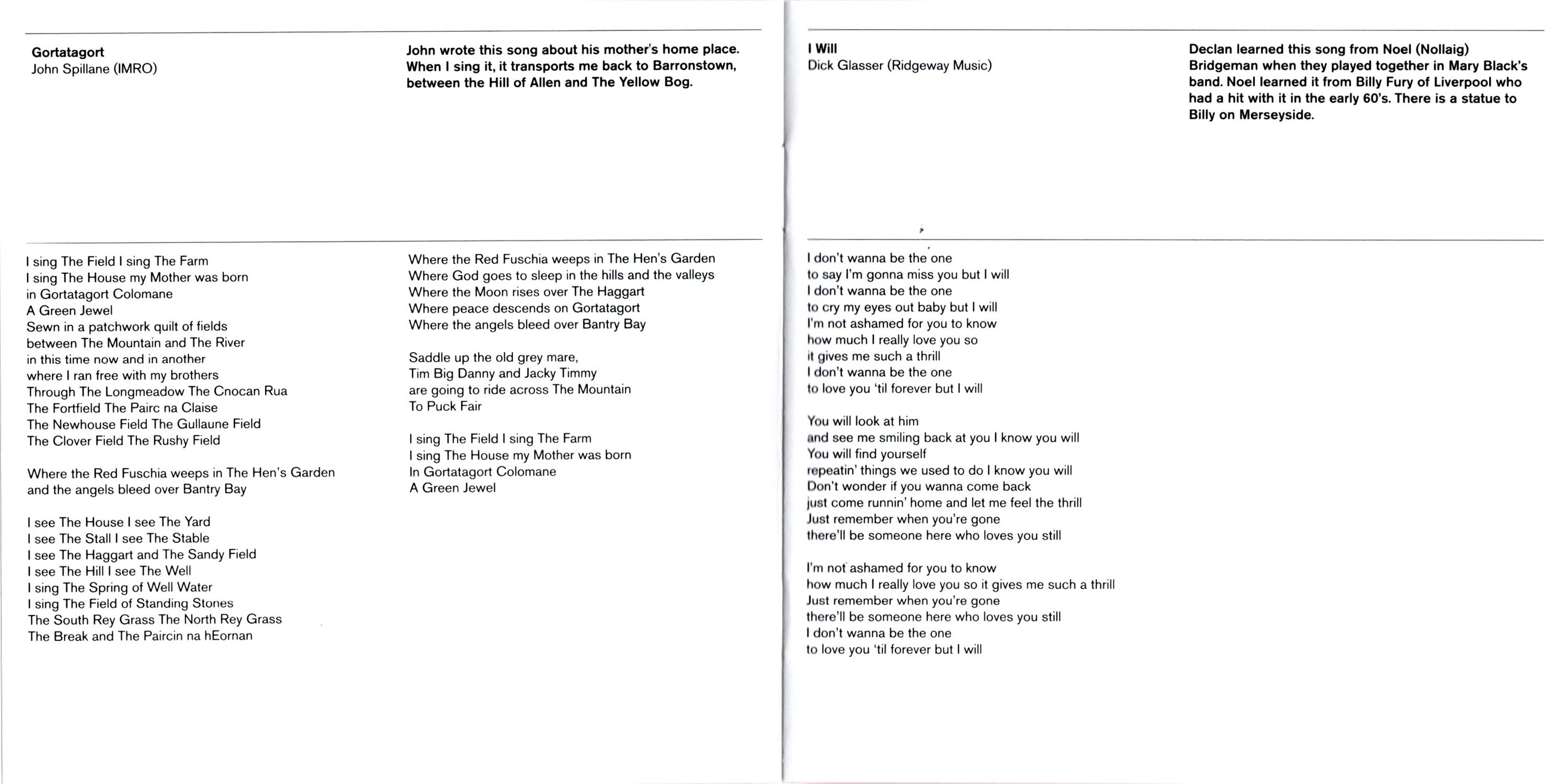 I Will — Declan learned this song from Noel (Nollaig) Bridgeman when they played together in Mary Black's band. Noel learned it from Billy Fury of Liverpool who had a hit with it in the early 60's. There is a statue to Billy on Merseyside.