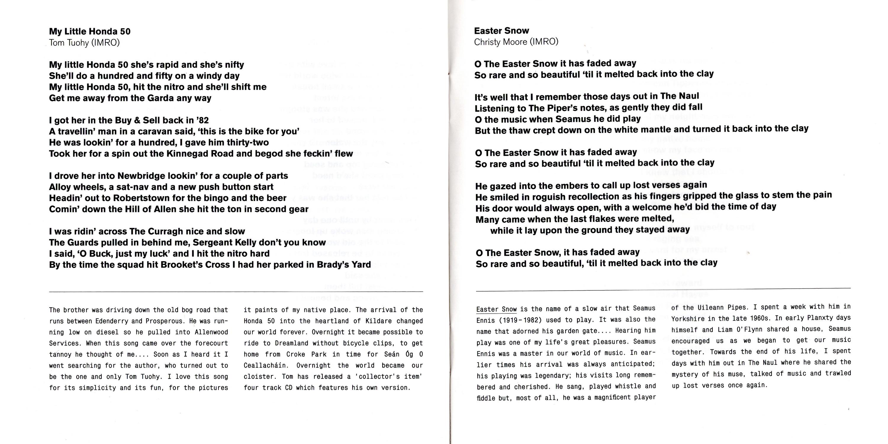 My Little Honda 50 — The brother was driving down the old bog road that runs between Edenderry and Prosperous. He was running low on diesel so he pulled into Allenwood Services. When this song came over the forecourt tannoy he thought of me … Soon as I heard it I went searching for the author, who turned out to be the one and only Tom Tuohy. I love this song for its simplicity and its fun, for the pictures of my native place. It paints of my native place. The arrival of the Honda 50 into the heartland of Kildare changed our world forever. Overnight it becane possible to ride to Dreamland without bicycle clips, to get home from Croke Park in time for Seán Og O Ceallachain. Overnight the world became our cloister. Tom has released a 'collector's item" four track CD which features his own version.