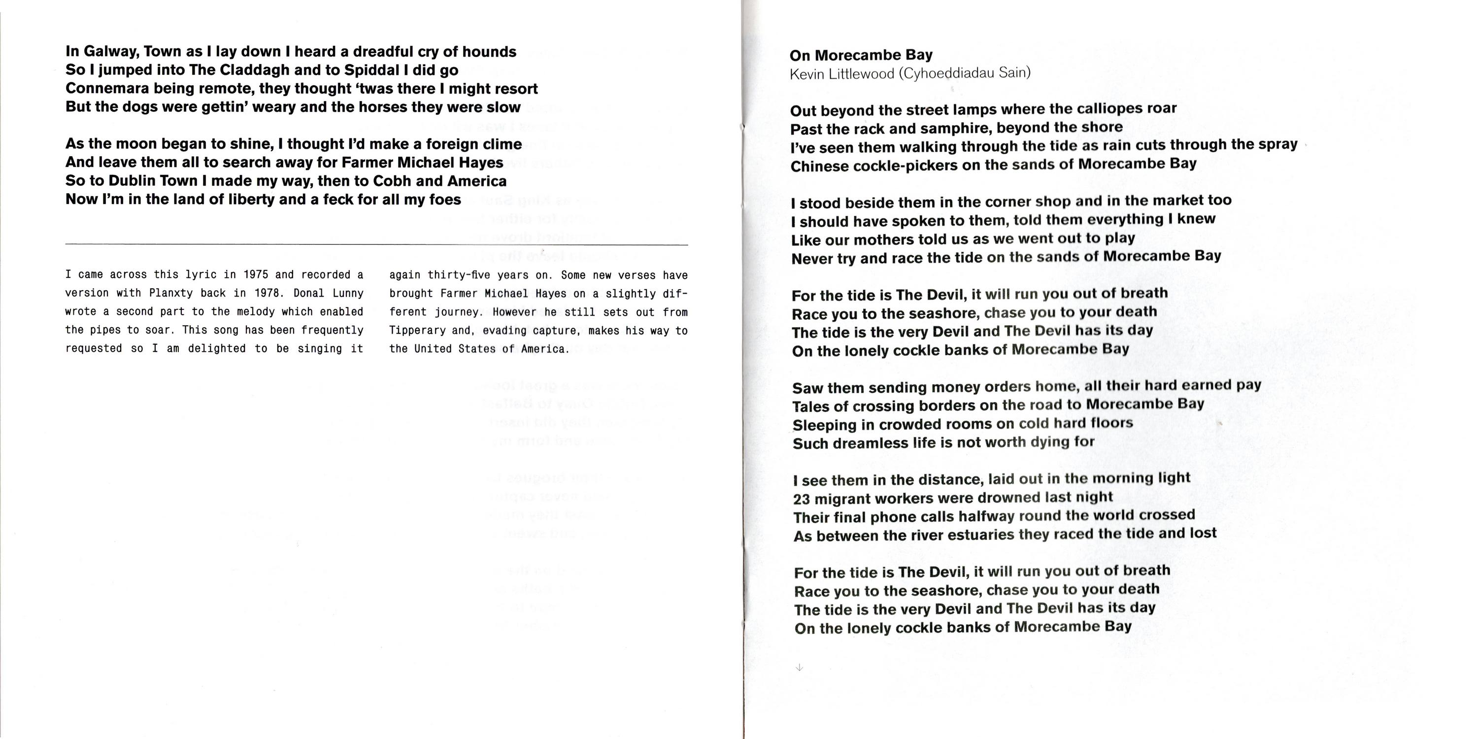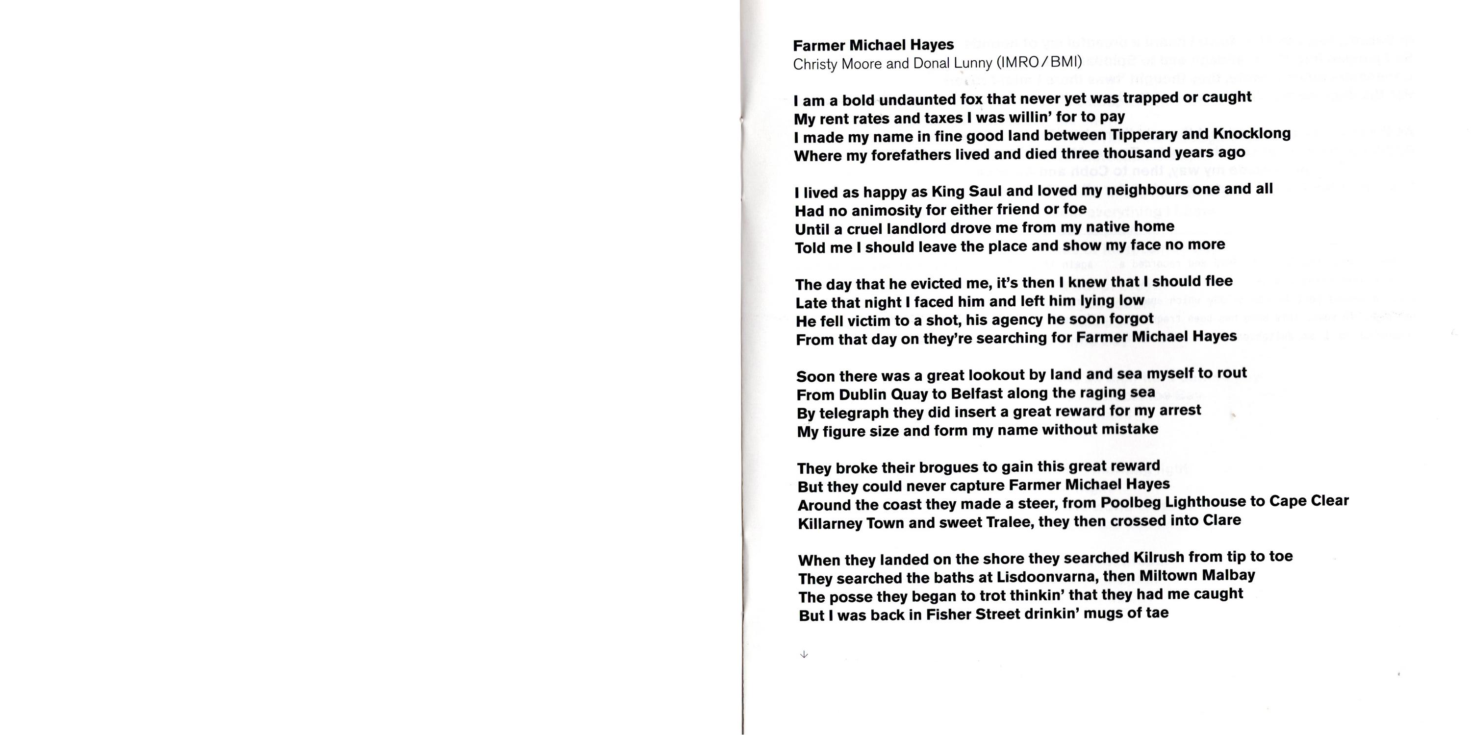 Farmer Michael Hayes — I came across this lyric In 1975 and recorded a version with Planxty back In 1978. Dónal Lunny wrote a second part to the Melody which enabled the pipes to soar. This song has been frequently requested so I am delighted to bo singing It again thirty-flve years on. Some new verses have brought Farmer Michael Hayes on a slightly different journey. However he still sets out from Tipperary and, evading capture, makes his way to the United States of America.